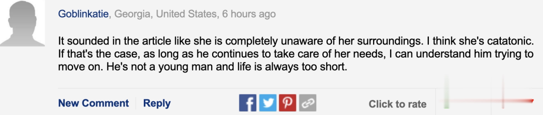 如果是这样的情况,那只要丈夫出钱请看护,那他选择离婚也可以理解。他也不是年轻人了,生命短暂,及时朝前走咯。”