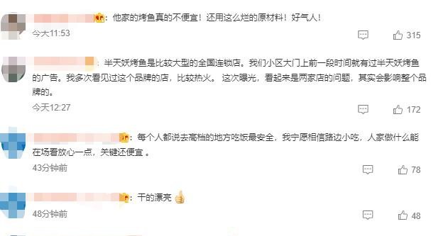 有网友表示,“他家的烤鱼真的不便宜!还用这么烂的原材料!”“看起来是两家店的问题,其实会影响整个品牌。”