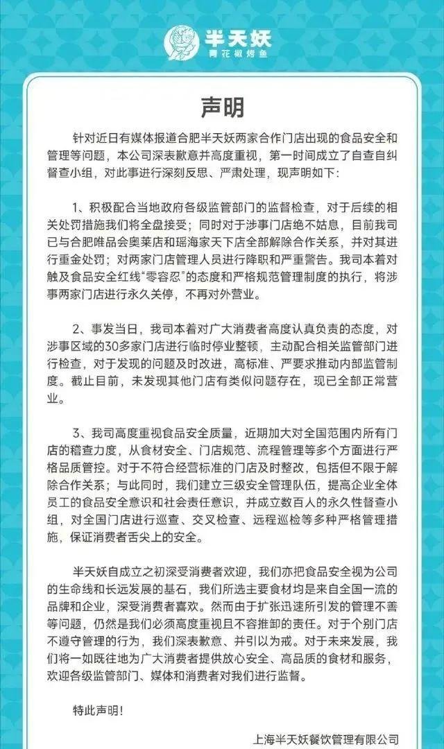 3月24日,针对“安徽合肥两家门店出现食品安全问题”一事,半天妖烤鱼官方微博发布声明,我司本着对触及食品安全红线“零容忍”的态度和严格规范管理制度的执行,将涉事两家门店进行永久关停,不再对外营业。