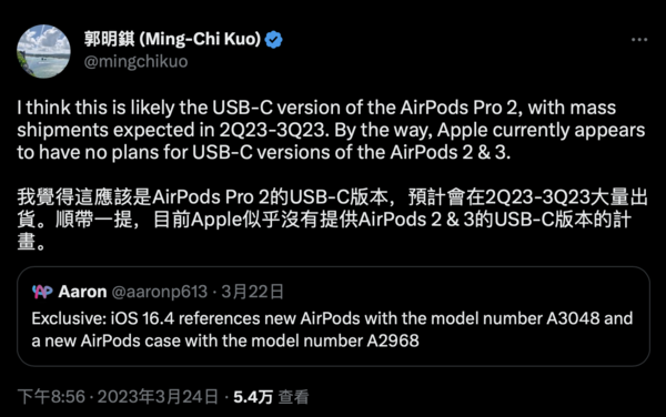近期有海外网友在iOS 16.4系统中看到了型号为A3048的新AirPods和型号为A2968的新AirPods外壳,并据此猜测苹果将推出全新的AirPods产品。不过分析师郭明錤则在社交媒体上表示,苹果并没有推出新款AirPods的计划,全新的AirPods外壳仅仅是AirPods Pro 2的USB-C版本。