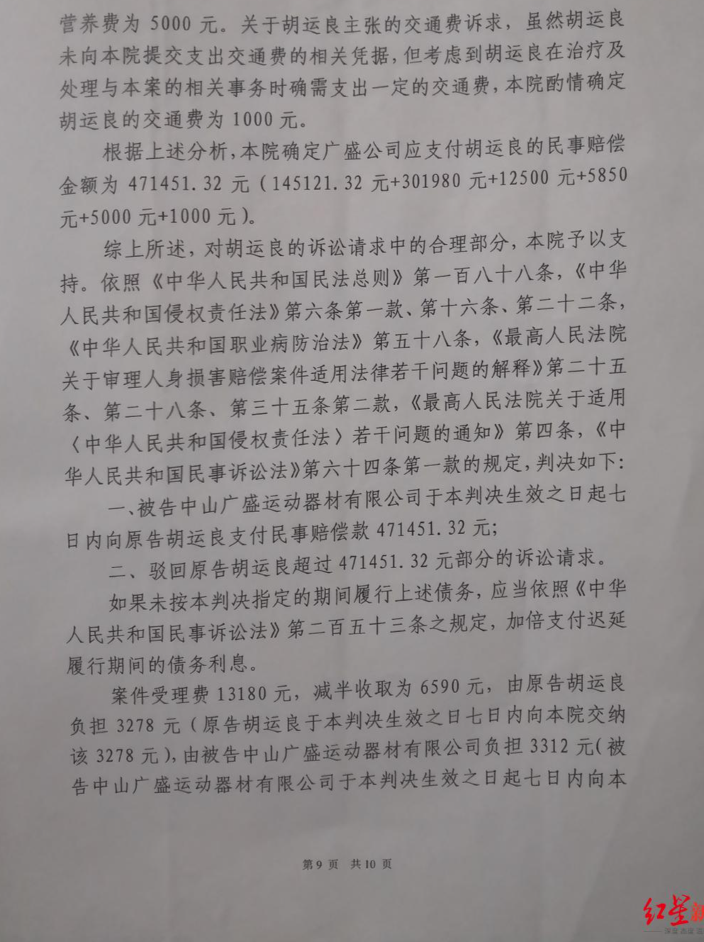 2019年6月,一审法院判决广盛公司向原告胡运良支付残疾赔偿金等6项民事赔偿款共计47.14万元。