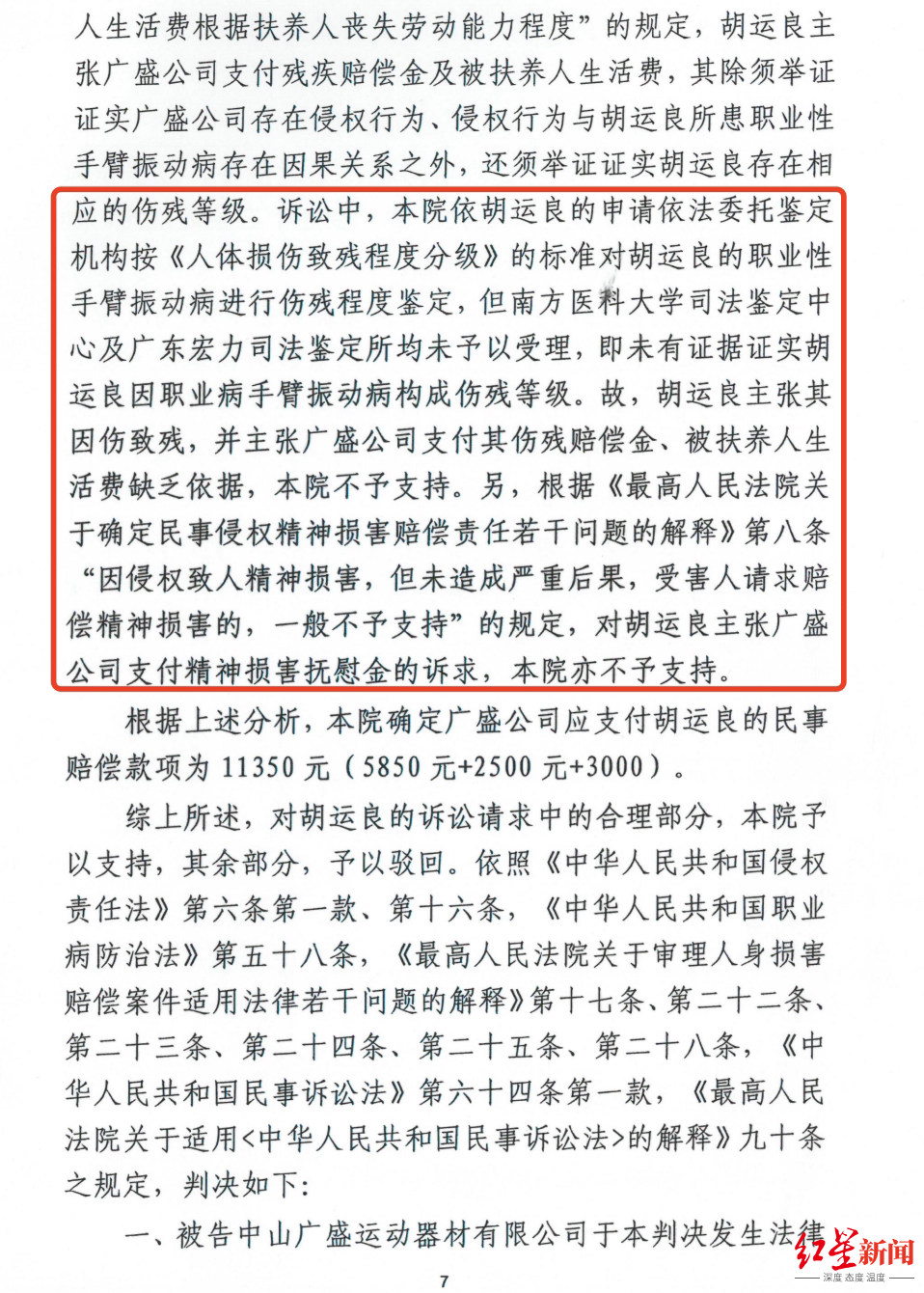 2021年,重审的一审法院仅维持伙食补助费差额、营养费、交通费3项民事赔偿共1.13万元,驳回残疾赔偿金在内的3项申请,原因是“鉴定标准缺失,第三方鉴定机构无法对胡运良的职业性手臂振动病进行伤残程度鉴定,因此没有证据证实胡运良因职业病手臂振动病构成伤残等级”。