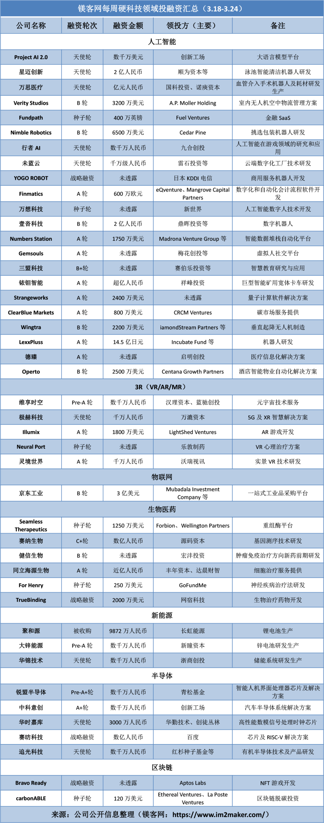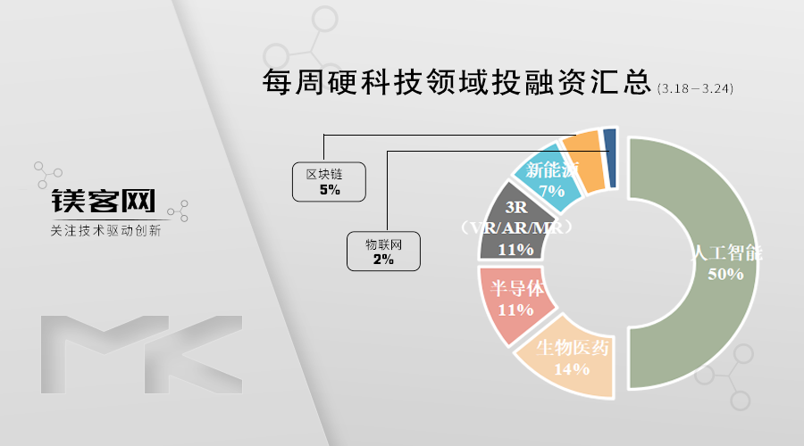 本周硬科技领域投融资事件一共44起,人工智能域发生22起融资事件,占比50%;生物医药领域发生6起融资事件,占比14%;半导体、3R(VR/AR/MR)领域各发生5起融资事件,分别占比11%;新能源领域发生3起融资事件,占比7%;区块链领域发生2起融资事件,占比5%;物联网领域发生1起融资事件,占比2%。