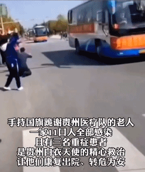 那年,贵州援鄂医疗队踏上归途,一位老人手持国旗,跪在地上,双手合十。