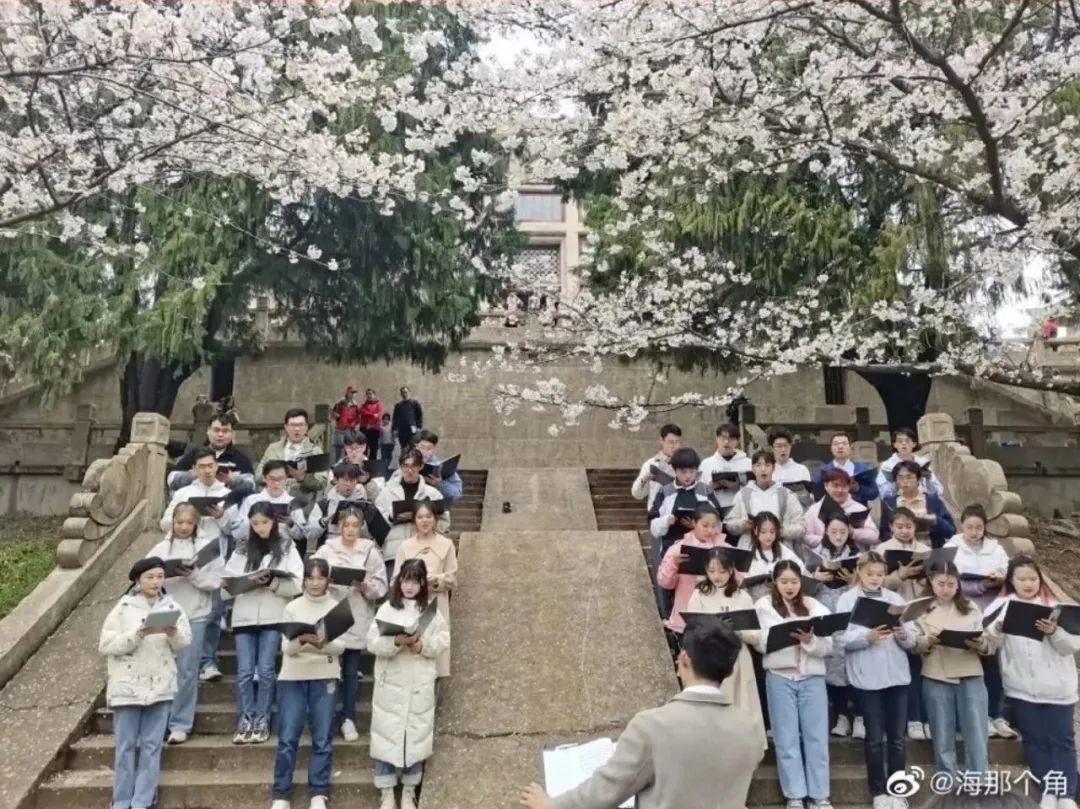 在盛开的樱花树下,武大学生为他们齐声歌唱。
