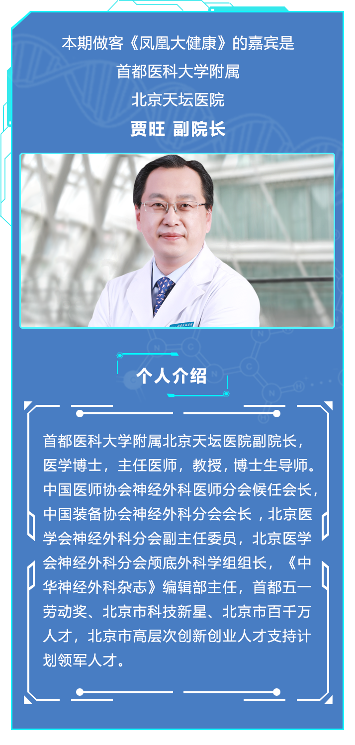 本期做客《凤凰大健康》的嘉宾是首都医科大学附属北京天坛医院贾旺,神经外科学中心李德岭,神经外科中心江涛,神经肿瘤外科保肇实