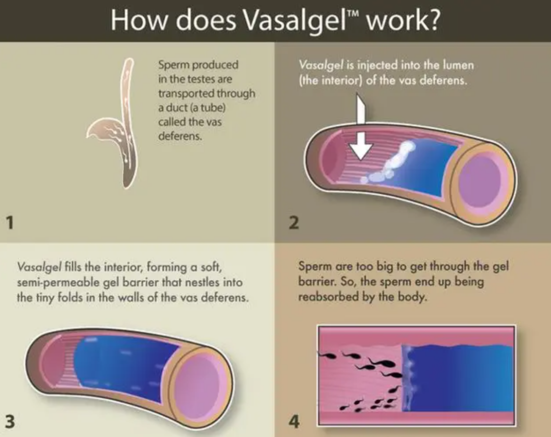 印度科学家发明的,目前已完成III期临床试验的「指导使用型可逆精子抑制技术」,是一项将凝胶材料注入男性输精管,随即释放大量正电荷形成酸性环境,从而分裂路过的带有负电荷的精子的技术。