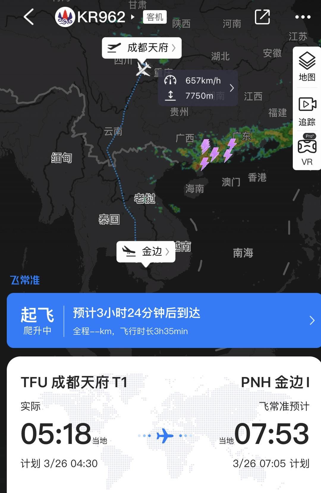 5点18分,柬埔寨航空KR962航班从跑道上起飞。飞常准上显示,该航班将于当地时间7点53分抵达柬埔寨金边机场,这也是成都天府国际投运以来首个出境航班。