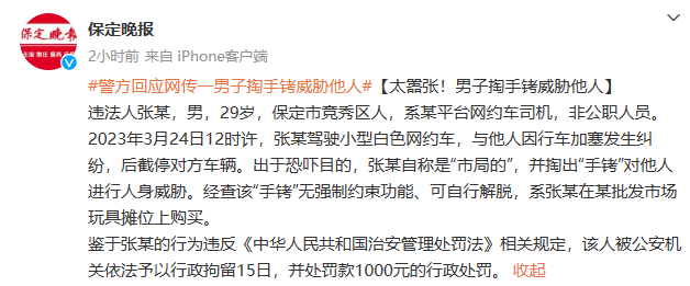 3月25日,一段“男子掏手铐威胁他人”的视频被曝光。河北保定警方回应:当事人为网约车司机,“手铐”为玩具。目前该男子已被拘留。