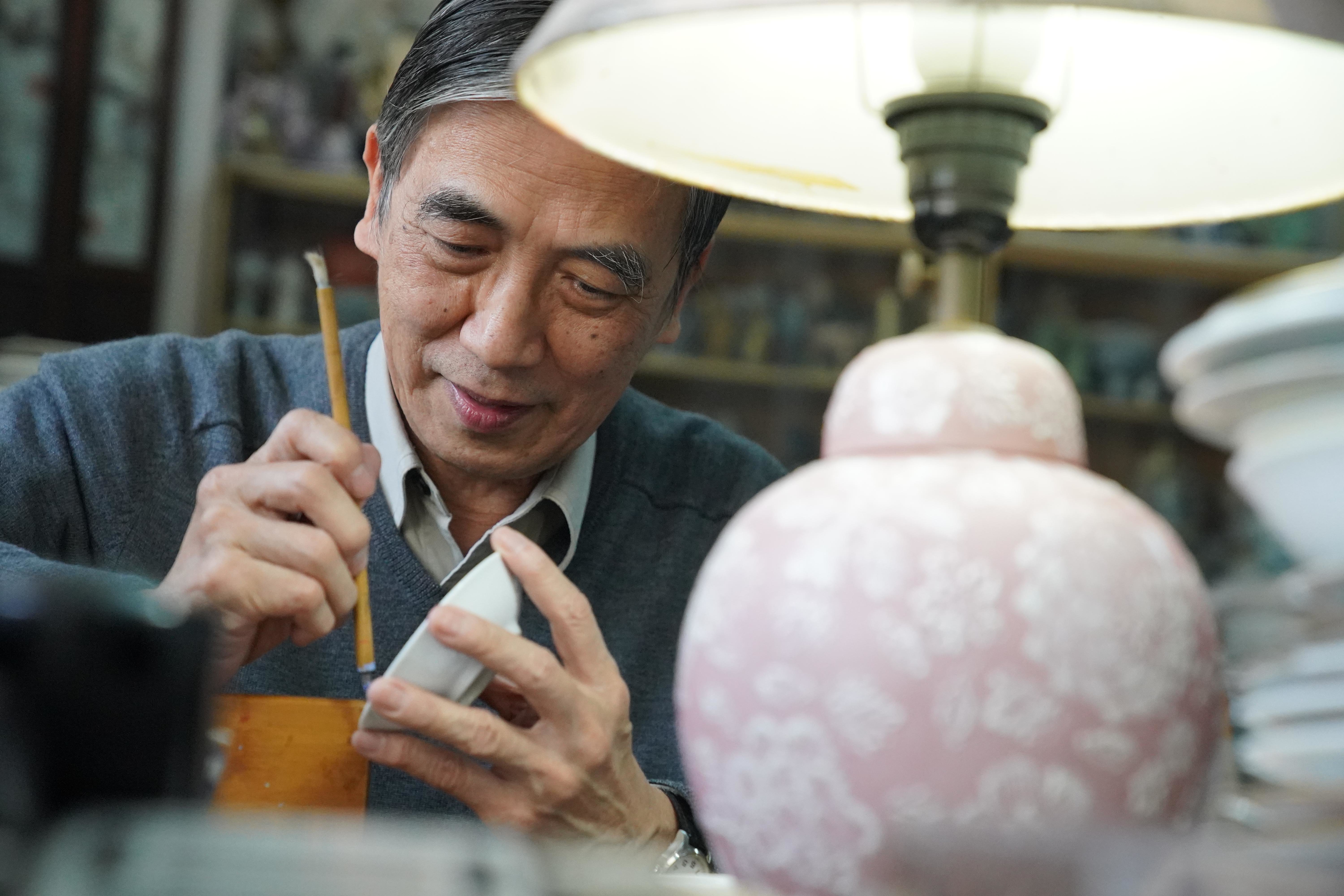 店铺角落里,两位师傅专注地在瓷胎上绘画或填色,丝毫不受干扰。提到广彩的技艺,粤东磁厂第三代传人、74岁的曹志雄颇为骄傲:“当年想要成为一名广彩绘工,至少拜师学艺三年。”