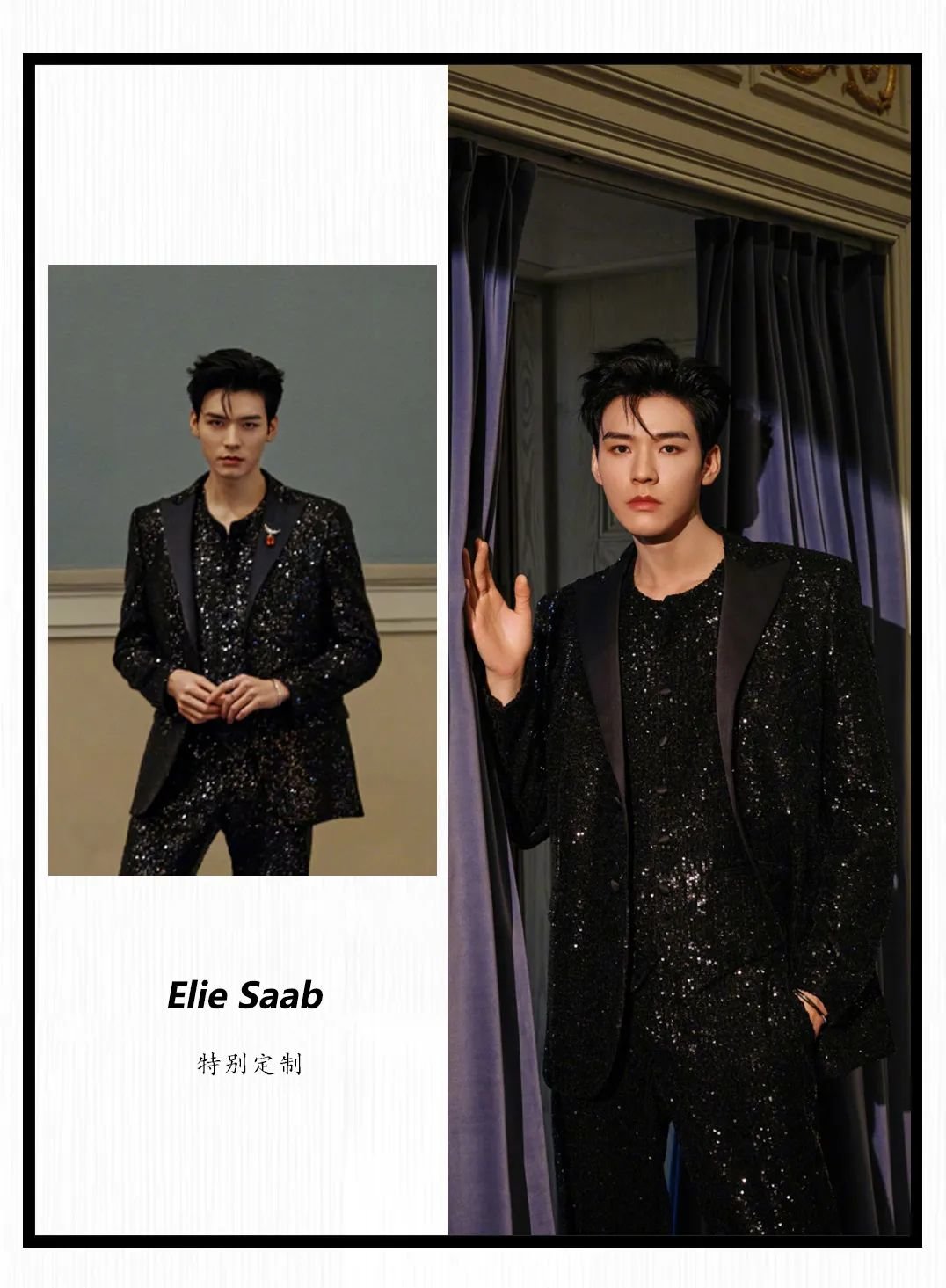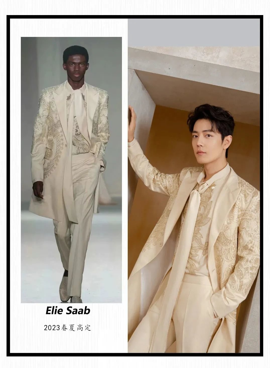 男明星这边最大的看点在肖战和龚俊。二人都穿了据说从不给“咖位低”的明星提供衣服的Elie Saab,肖战穿的是Elie Saab 2023男装高级定制系列香槟金刺绣套装。