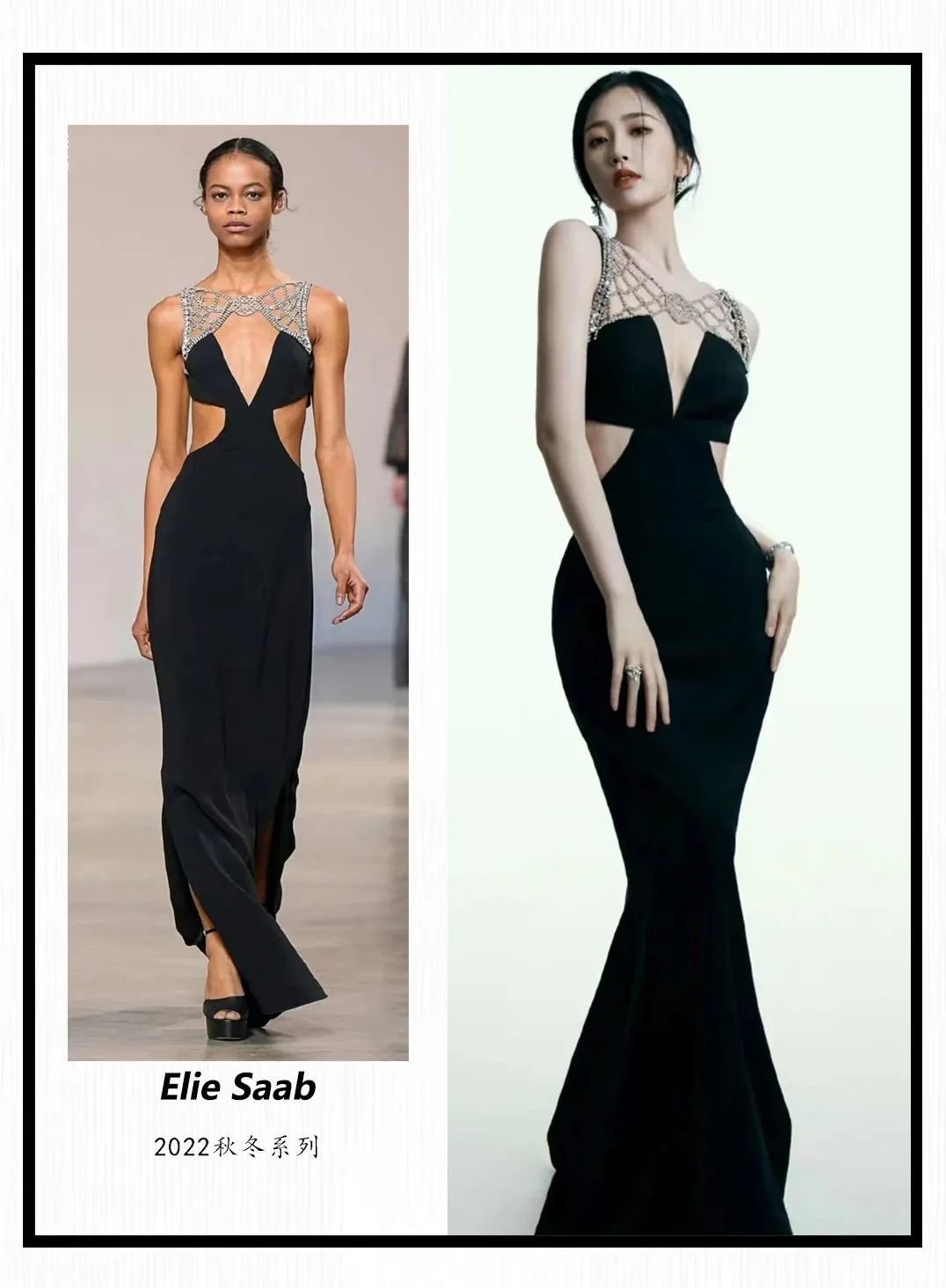 还有靠《苍兰诀》爆火的虞书欣也穿了Elie Saab2022秋冬系列,虽然不是高定,但非常适合虞书欣瘦而有料的身材,侧腰的镂空将视觉重心集中到腰臀比,钻石与黑色连衣裙也是经典却十分有效的soulmate。