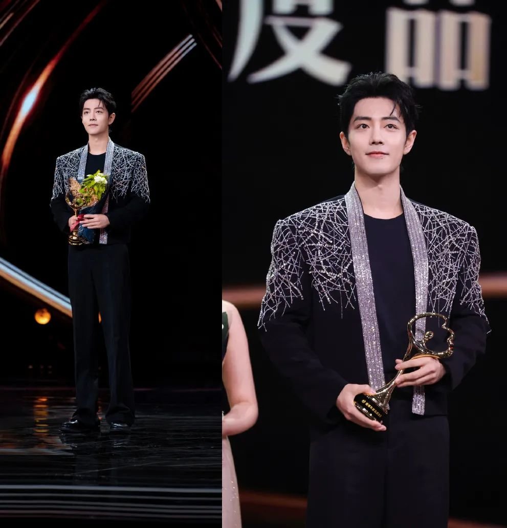 肖战的头肩比欠佳,所以对肩部线条要求很高,这套西装虽然有一定调整比例的作用,但刺绣和服装材质都很柔和,显得拘束紧绷,香槟色又和皮肤相近,远处看宛若一件衣服在自己行走。