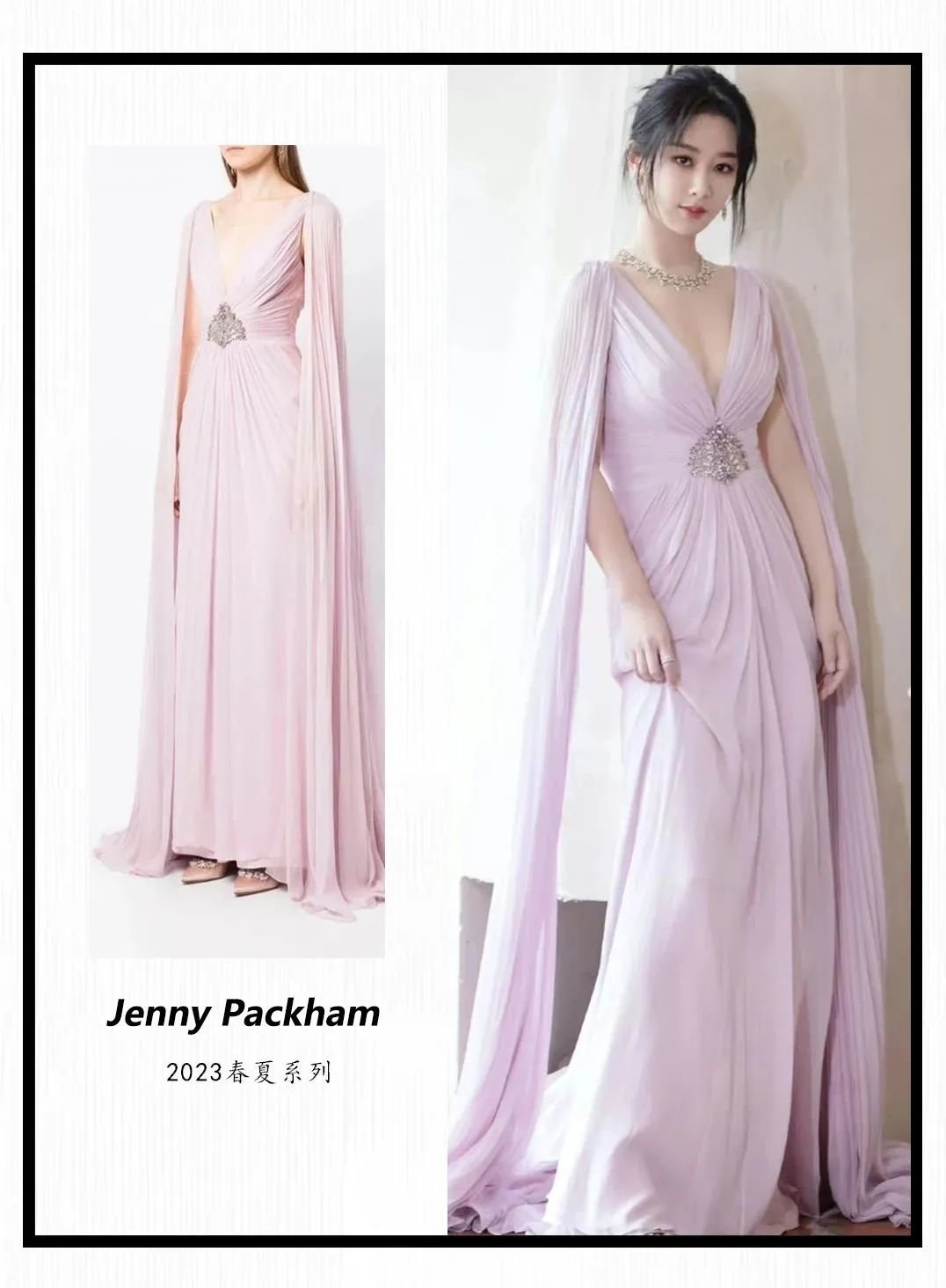至于造型一般的有杨紫这套Jenny Packham,主要问题在于从颜色到造型都显老,模特骨感的身材能穿出清冷仙气,但杨紫凹凸有致的身材就容易破坏掉褶皱本身的流畅感,视觉重心的腰间装饰又过于女人味,和杨紫的甜妹脸非常不搭。