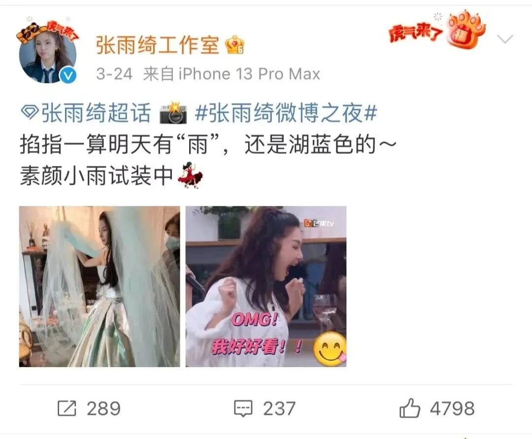 内卷如张雨绮的工作室甚至头一天就发了图片,提前吃到了红毯造型流量的红利。