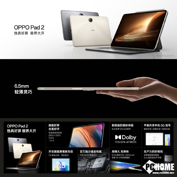 性能配置方面,OPPO Pad 2是首批搭载天玑9000旗舰芯片的平板,拥有3.05GHz超大核主频,强大的运算性能和4nm先进制程;续航方面,OPPO Pad 2配备9510mAh大电池、支持67W超级闪充。