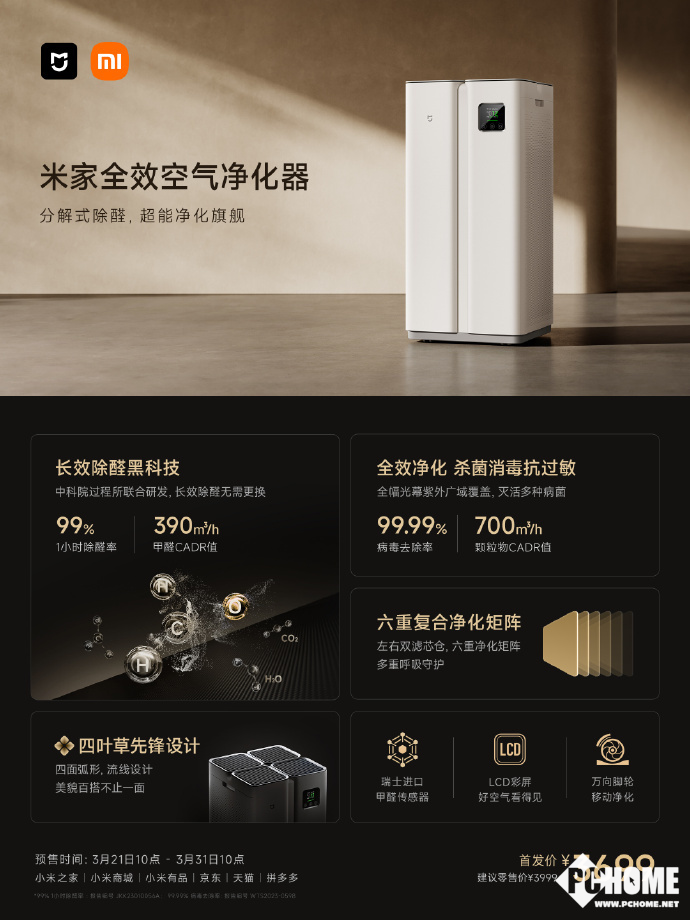 米家全效空气净化器支持长效除醛,采用分解式除醛技术;采用全幅光幕紫外消杀,拥有99.99%病毒去除率;采用左右双滤芯仓;采用四面弧形流线设计。米家全效空气净化器预售到手价3699元。