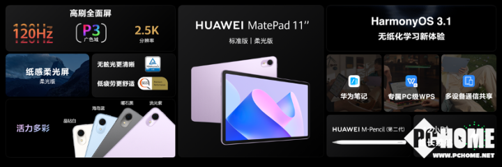 华为纸感柔光屏搭配HUAWEI M-Pencil(第二代),屏幕表面的纳米级纹理与手写笔摩擦形成更好的阻尼感与振动感,还原纸感读写体验。华为MatePad 11英寸2023款标准版和柔光版都搭载120Hz高刷全面屏,拥有电影级P3广色域、2.5K分辨率。