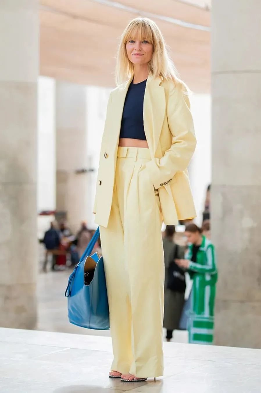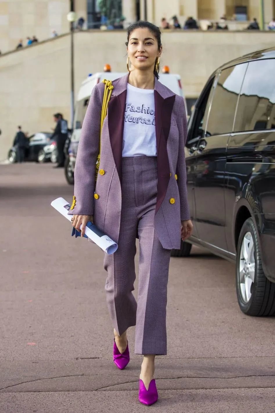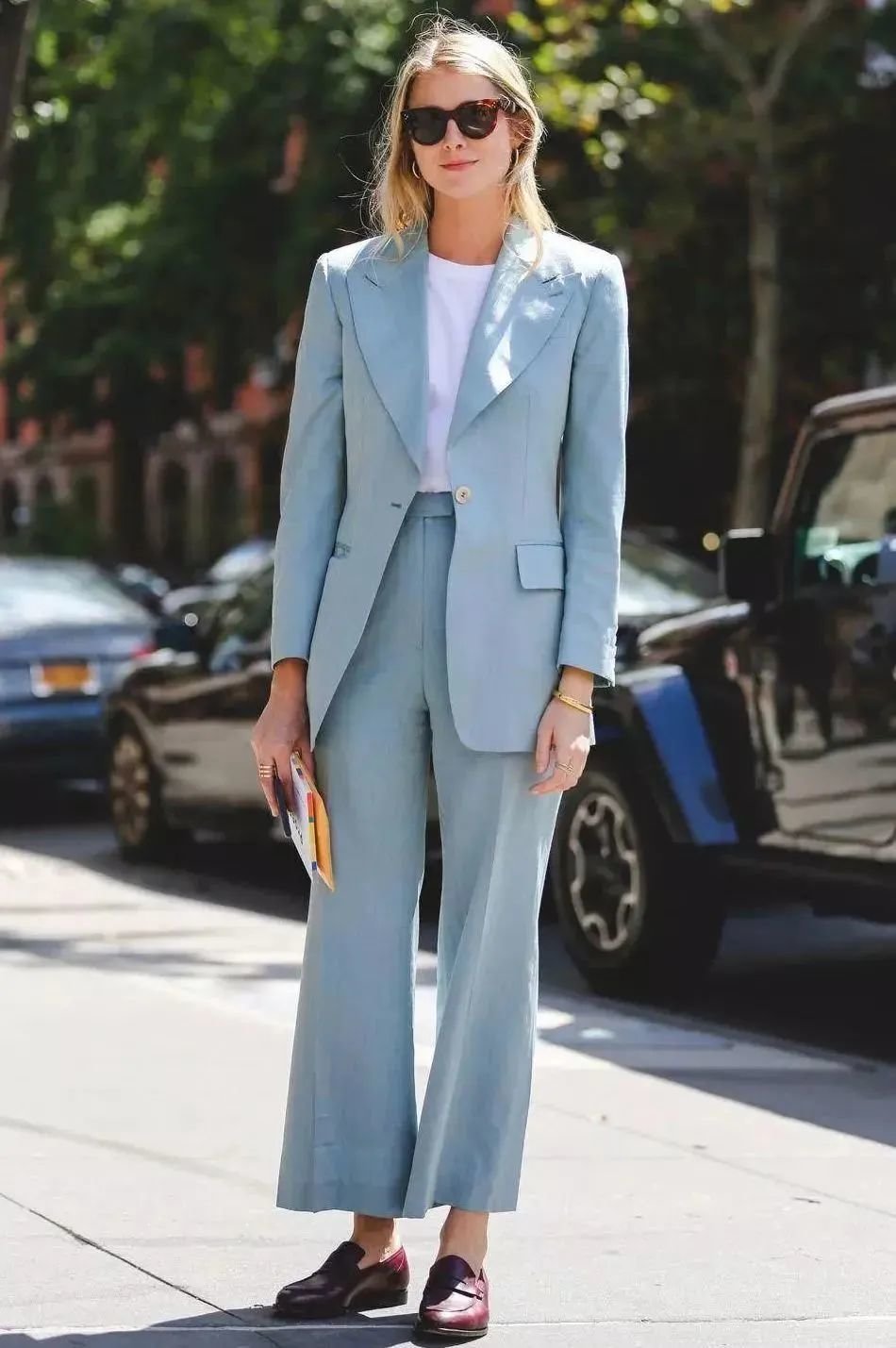 除了刚才两件基础色西装,T恤特别适合当一些彩色西装的内搭。成套的西装加了白色或者黑色打底后,穿起来就特别自然清爽、有时髦感。
