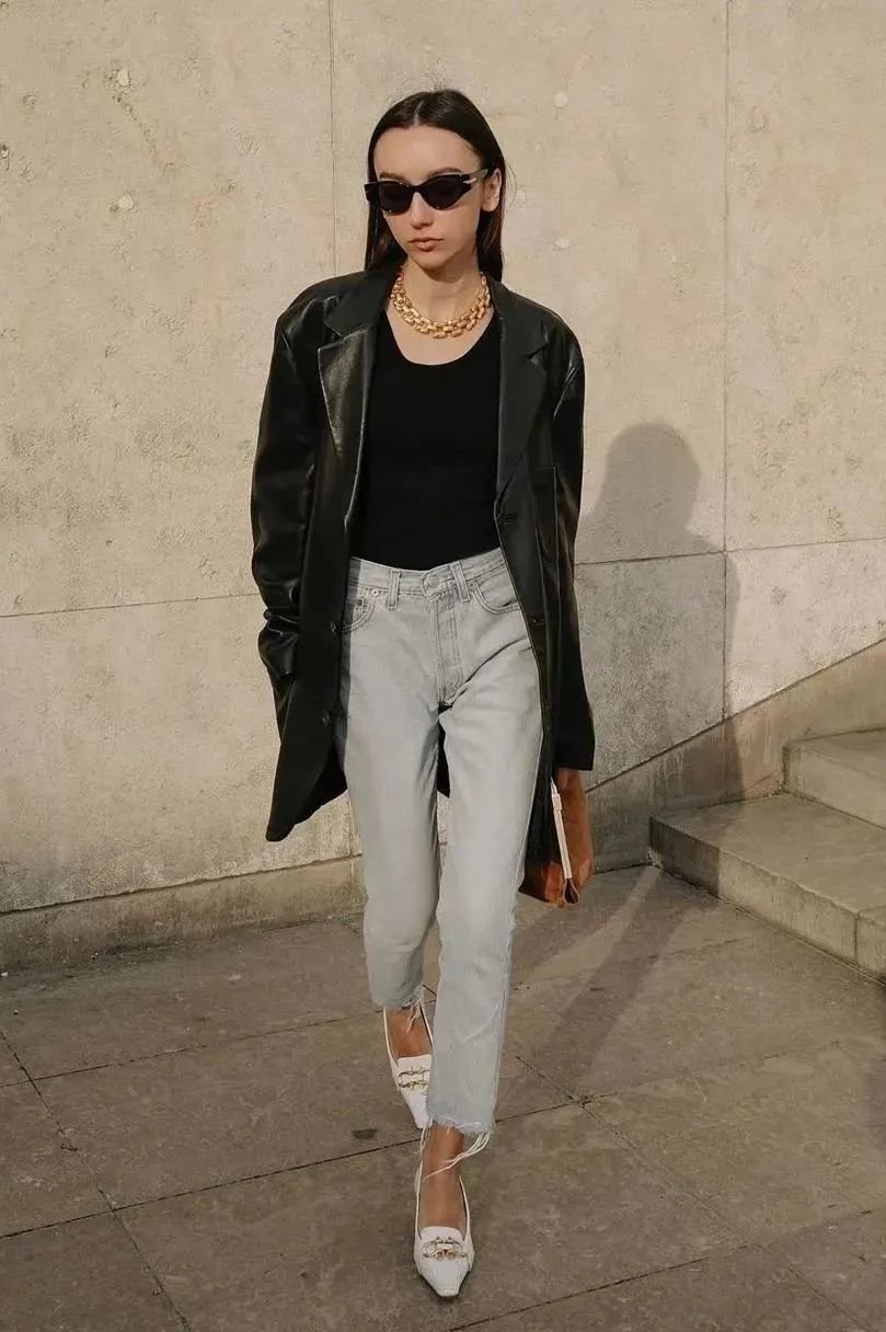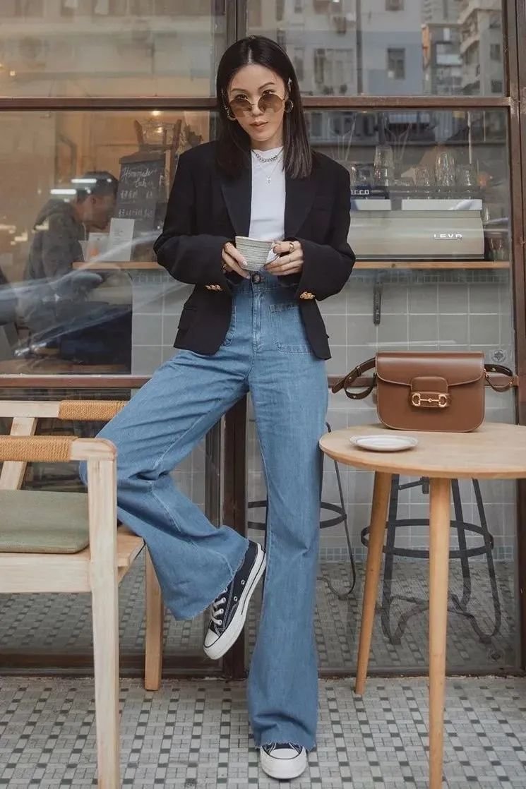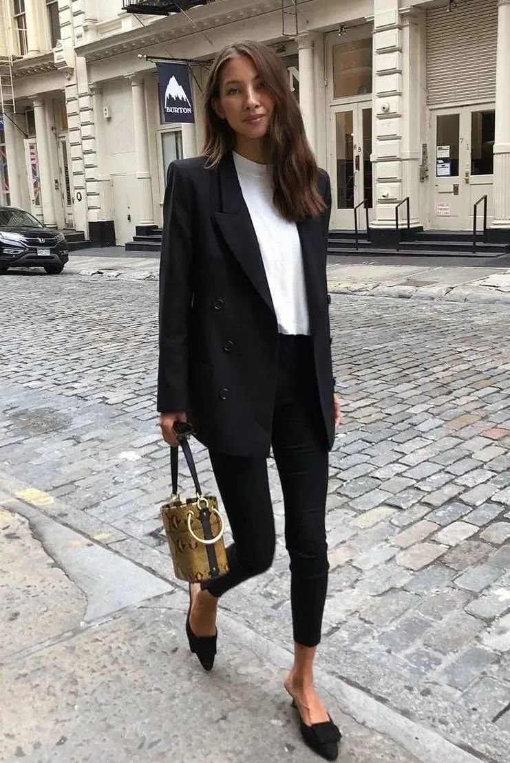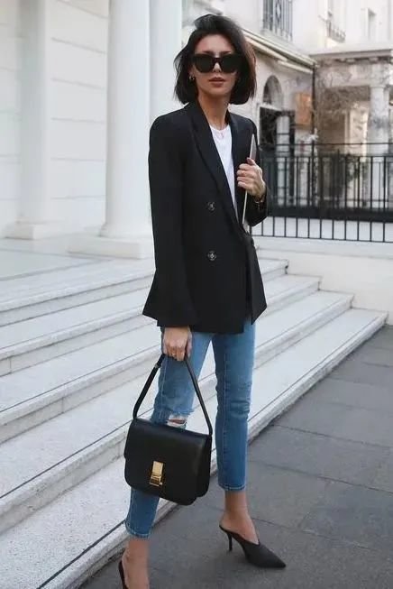 黑色西装是经典中经典,一件能穿很多年呢~黑西装、白T恤、牛仔裤三件套一起就是春日最合适的上班装。