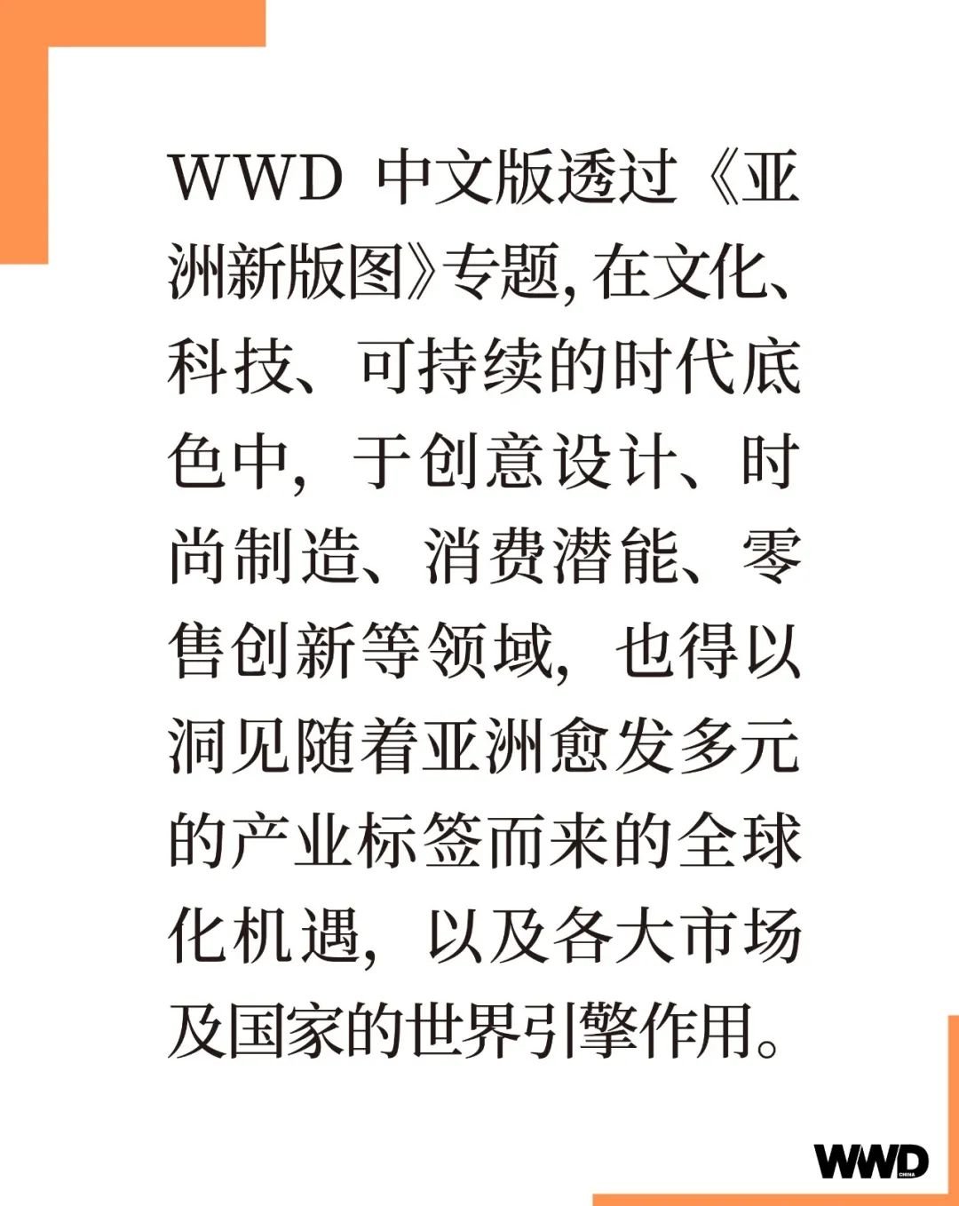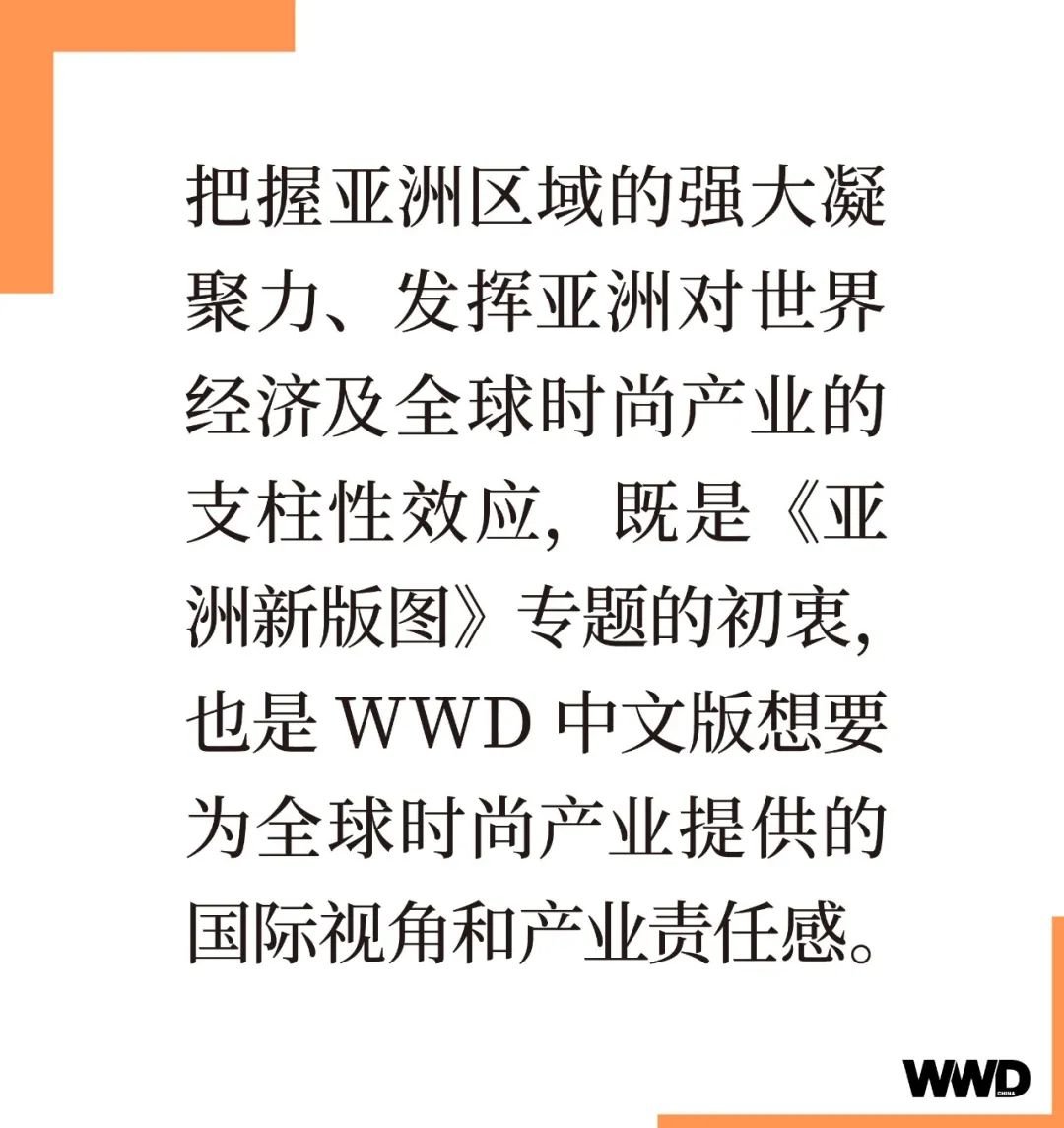 作为时尚产业权威媒体,WWD 中文版一直立足中国、放眼全球。在 2023 这一至关重要的时间节点,把握亚洲区域的强大凝聚力、发挥亚洲对世界经济及全球时尚产业的支柱性效应,既是《亚洲新版图》专题的初衷,也是 WWD 中文版想要为全球时尚产业提供的国际视角和产业责任感。