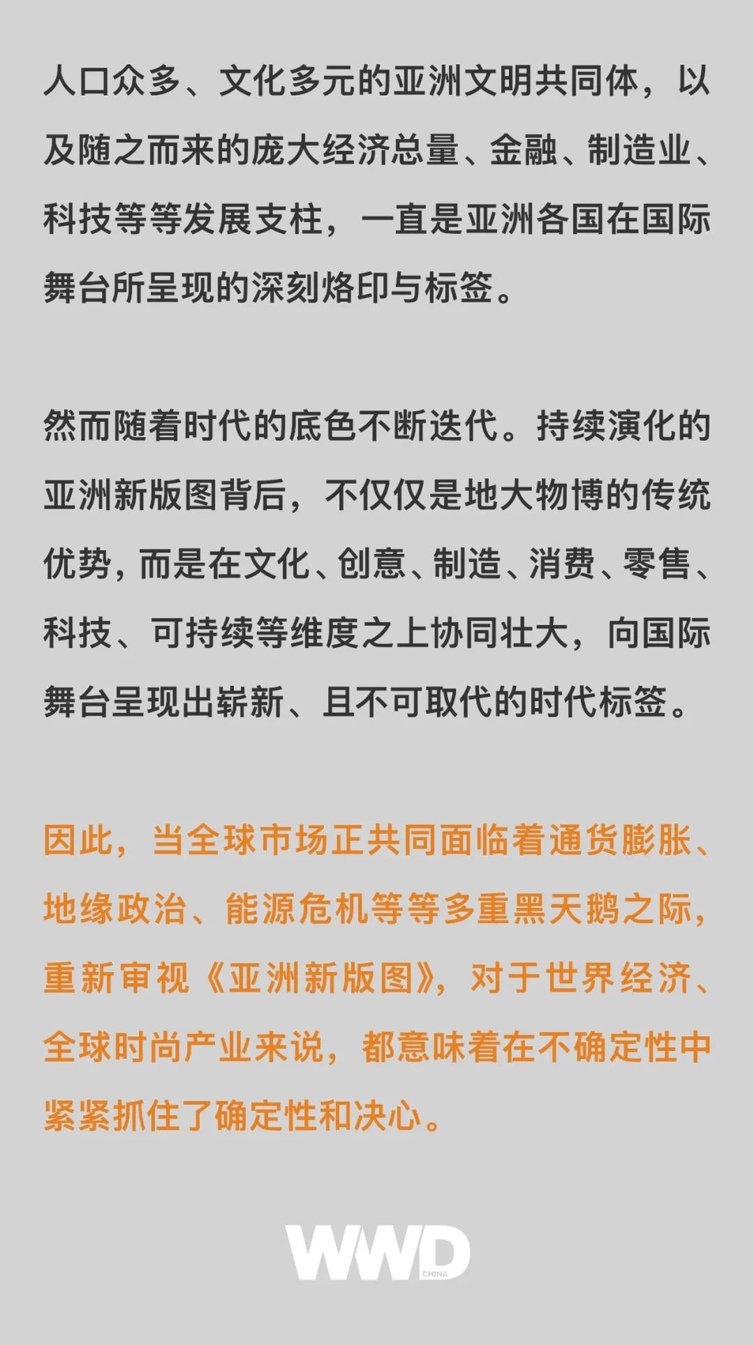 在 WWD 中文版《亚洲新版图》专题开篇之际,我们曾提到“亚洲时代的到来”。今天,《亚洲新版图》专题正式收官,通过在文化、科技、可持续三大时代主旋律下,对亚洲11个重要市场、国家在文化、创意、制造、消费、零售、科技、可持续领域的深入洞察,我们透过亚洲的全新标签,看到了亚洲各国近在咫尺的协同发展机遇。