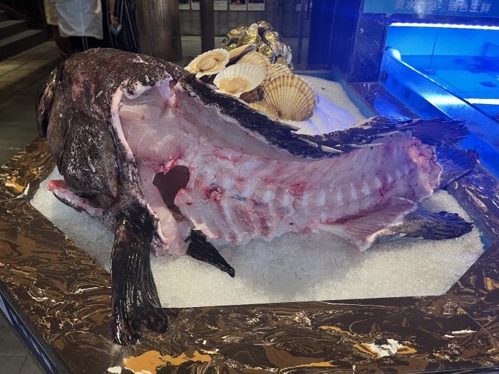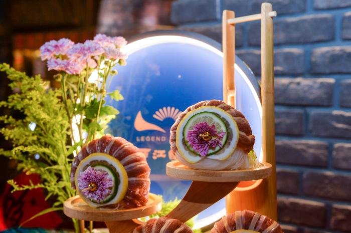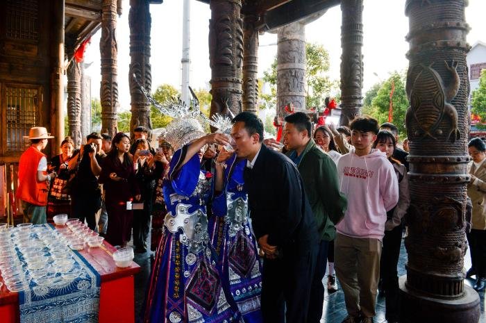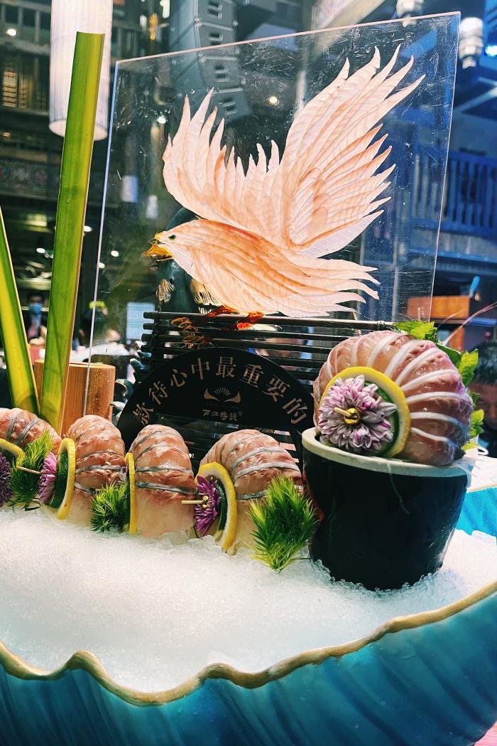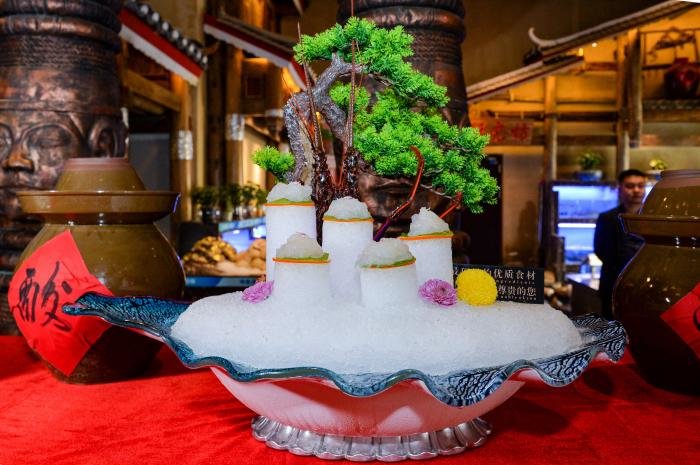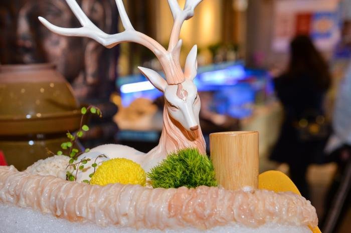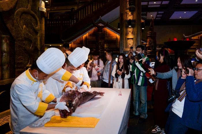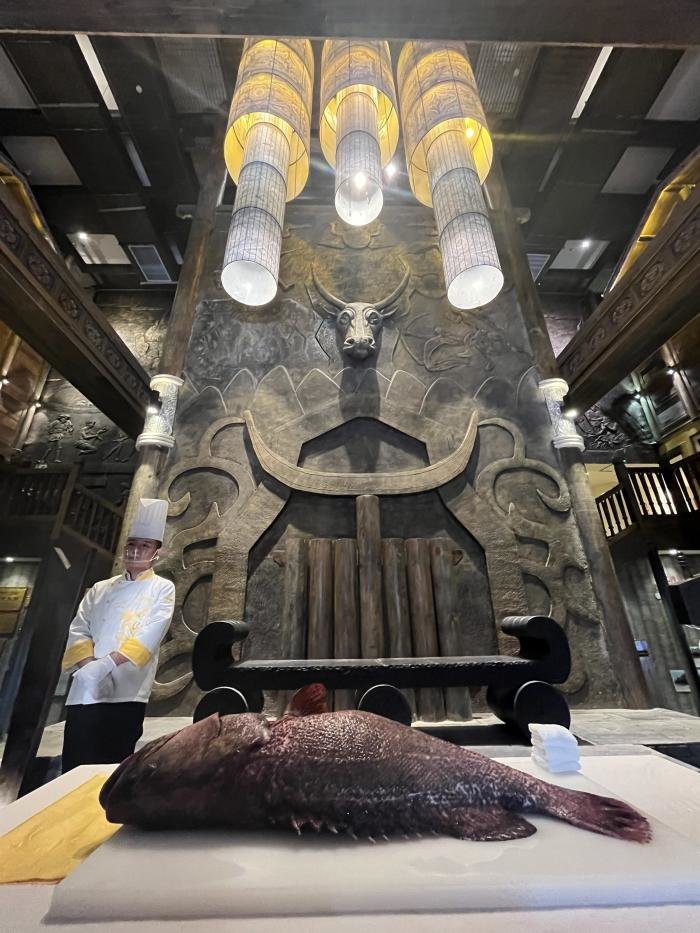 夜幕降临前夕,受邀媒体、网红及嘉宾接踵而至,芦笙悠悠伴随着高亢的苗族敬酒歌,客人们体验了甜美的拦门酒,大厅两边展现着世界知名的海鲜大拼盘,中间是一条近百斤的大龙趸,三个大厨正在分割。
