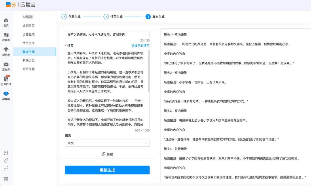 3月27日,一览科技推出业界首个基于GPT大模型的“文本+图片+虚拟人”视频AIGC全域工作流,搭载于旗下视频创作者工具“一览运营宝”,专注服务影视及短视频行业人群。首期上线产品为集创意、情节、脚本自动生成于一体的“AI编剧”,无需专业指令,三步即可生成专业脚本。