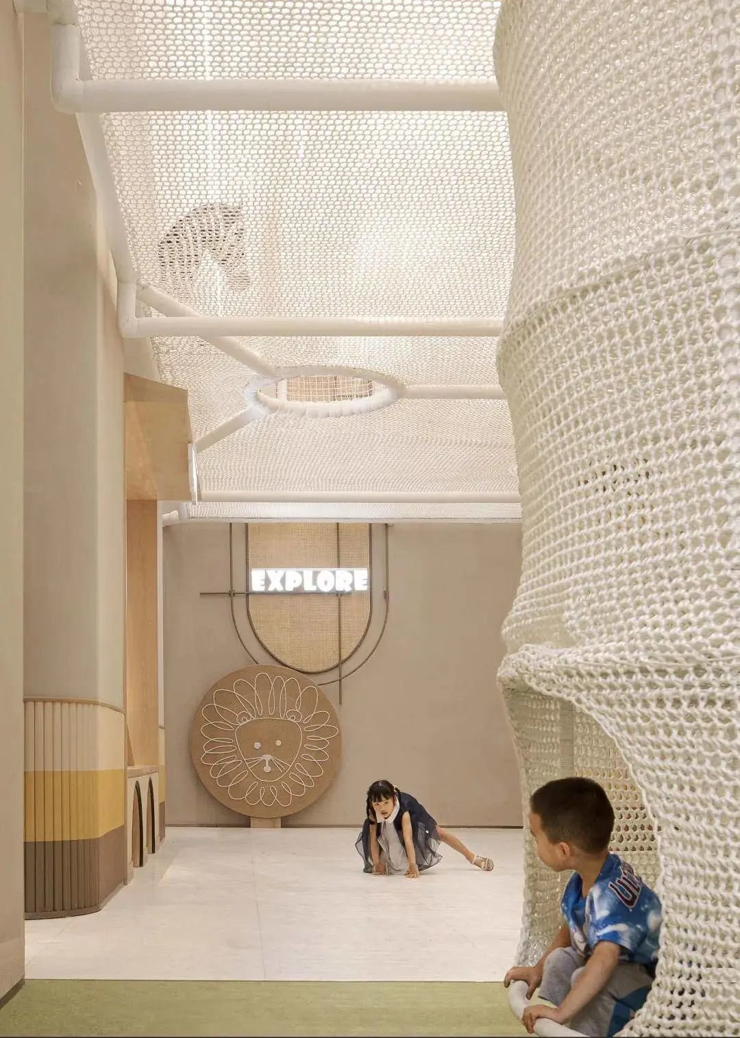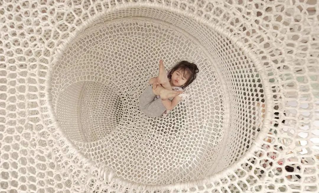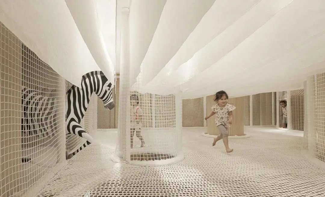 乐园的二层仿佛就是一个梦幻的云端王国,小朋友可以通过攀爬网上至二层,和一层的水吧形成隔空互动交流,中途还可以遇见各种各样可爱的动物伙伴。