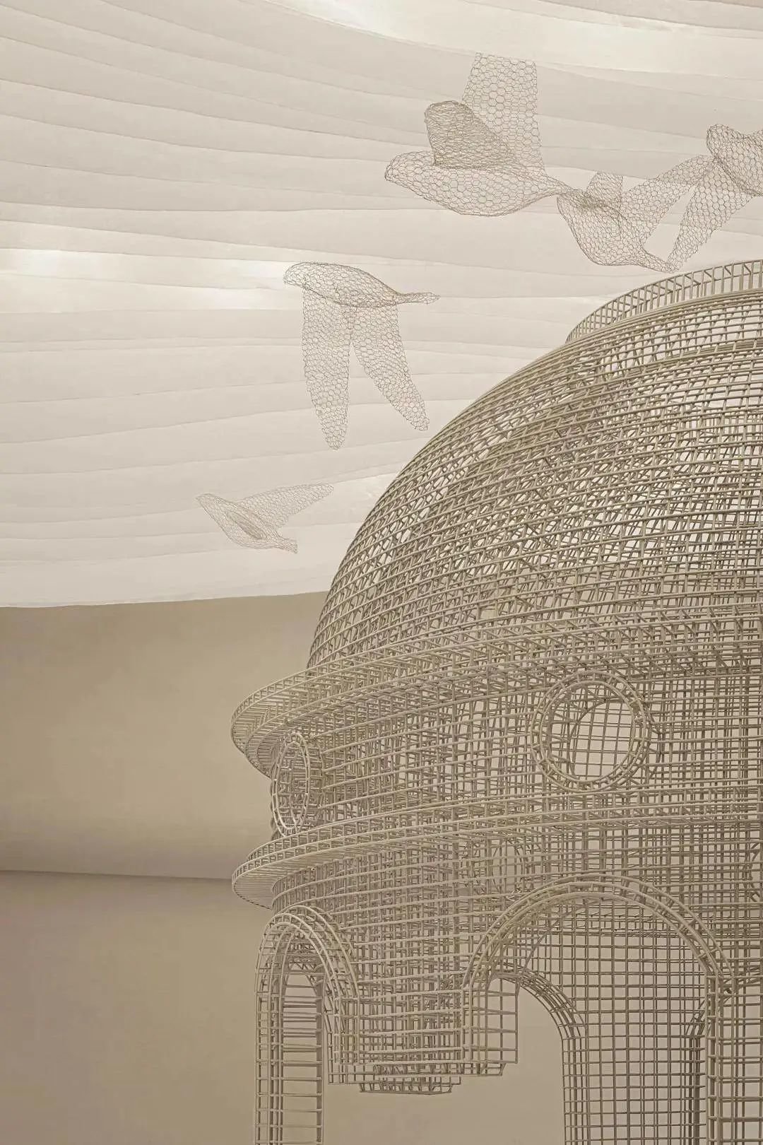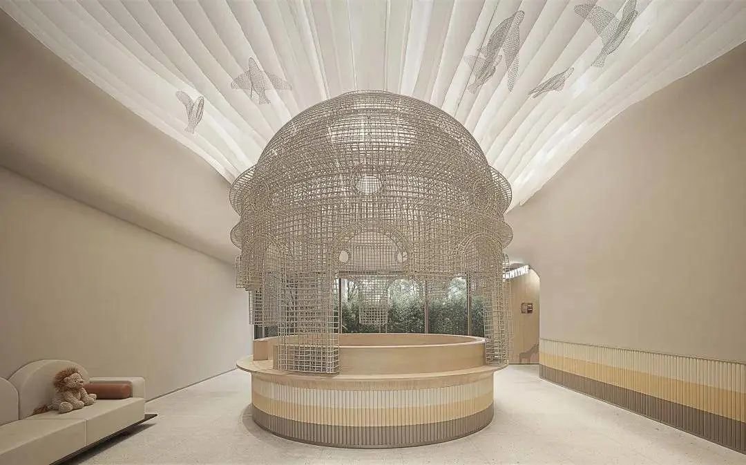 前台接待区设计师用铁丝模拟鸟笼造型,迎宾服务生在笼子内欢迎光临乐贝的每个小朋友,是整个动物王国的开端。