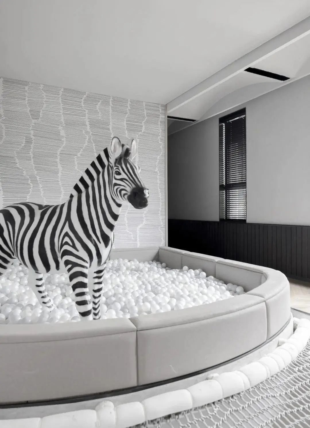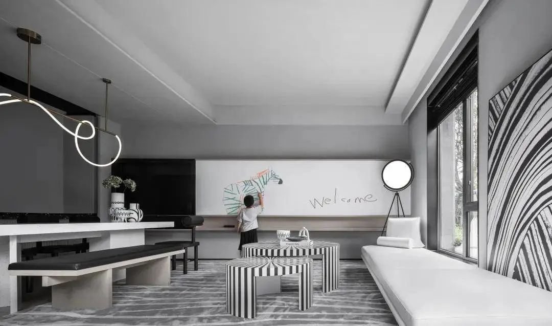 斑马主题民宿以艺术的冒险为主题,斑马在媒体上一直是时尚的宠儿,设计团队由斑马时尚的条纹中提取灵感,在空间中布置了涂鸦绘画板,攀爬网,泡泡池等亲子互动空间。线条及块面的设计元素处理,无形中也是对孩子审美的提升。
