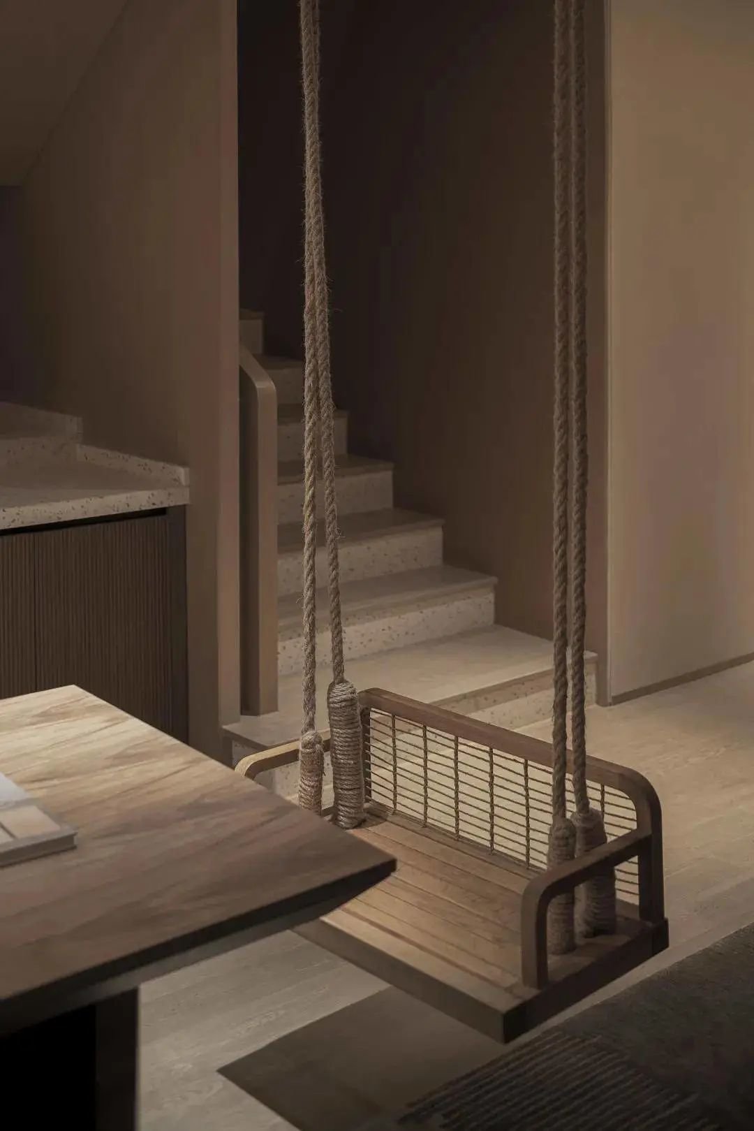 该主题亲子民宿主材主要选择符合狮子主题特色的材料:米黄色肌理漆及木饰面,且在空间中设置了木屋,秋千,木马及具有勇气象征的小型攀岩墙作为 亲子互动元素 。