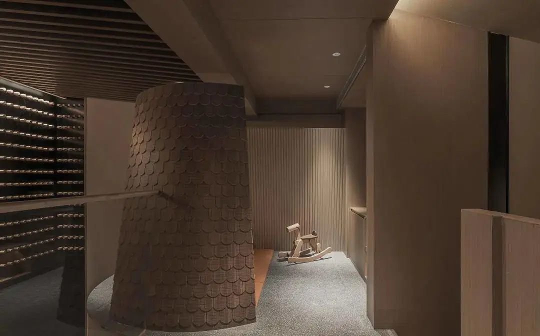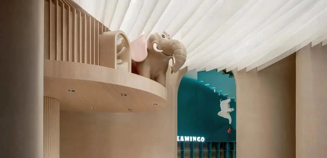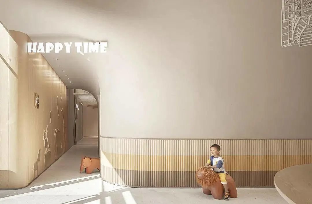 同时大面积的稻草肌理漆统一了整体空间的调性。软装选用了低饱和度的彩色及线条涂鸦风格造型及动物雕塑,整体营造了一个丰富多彩的动物王国冒险岛。
