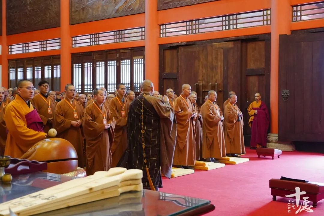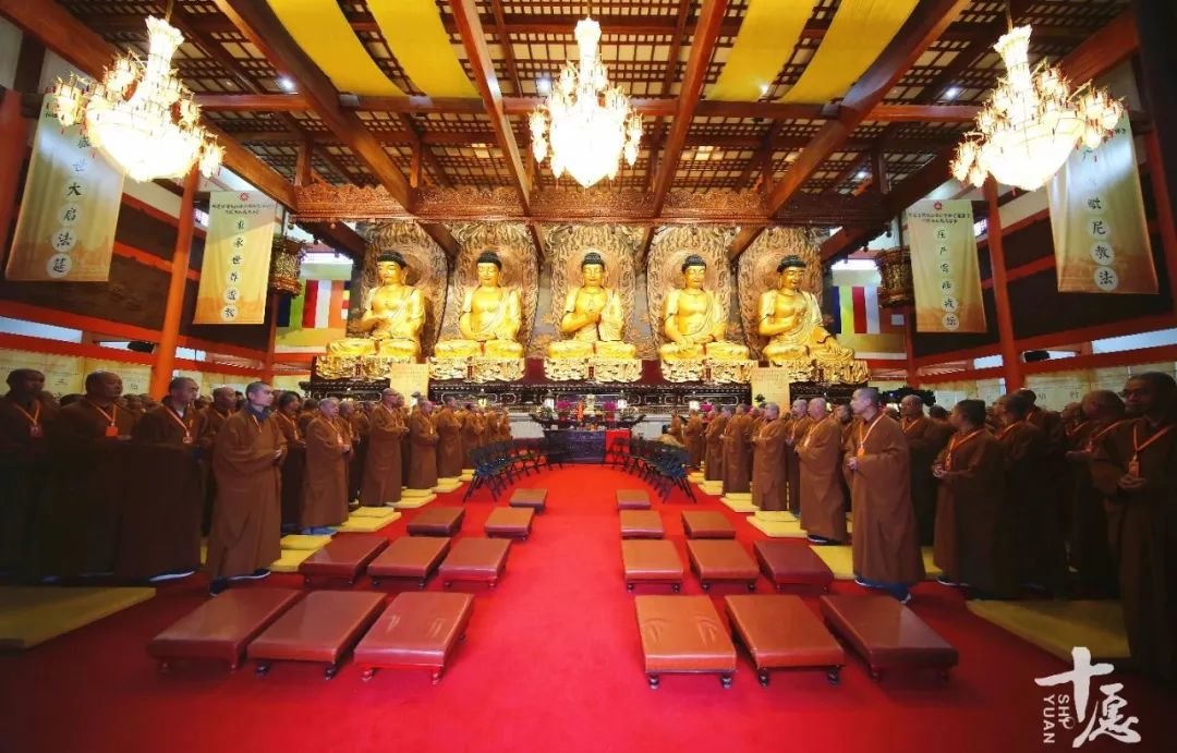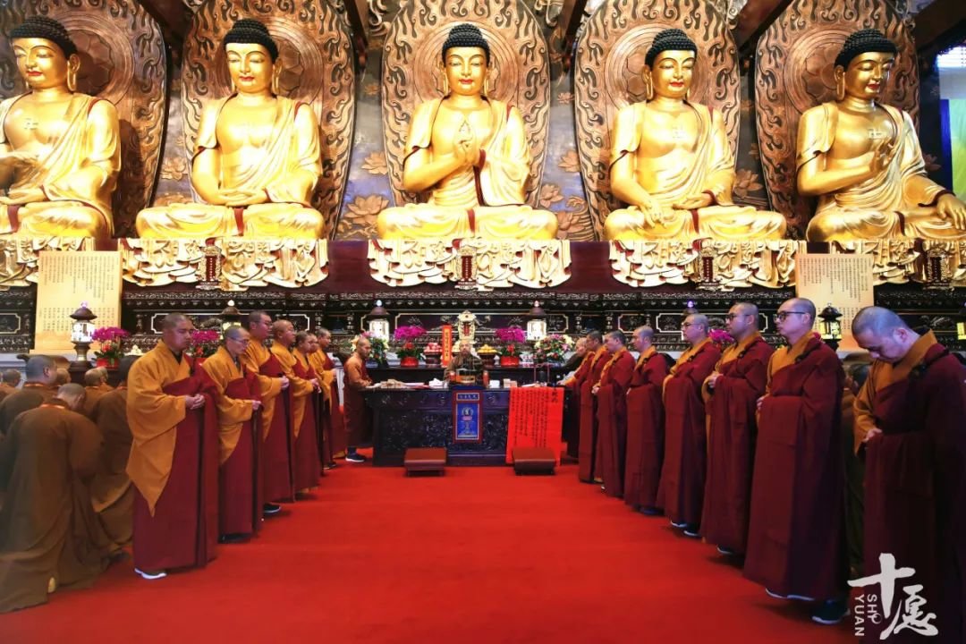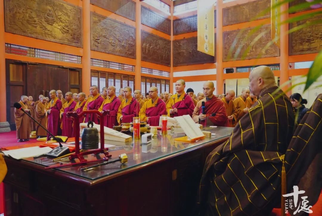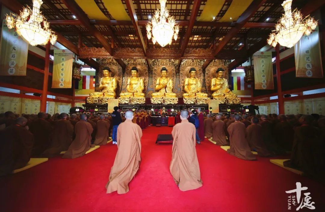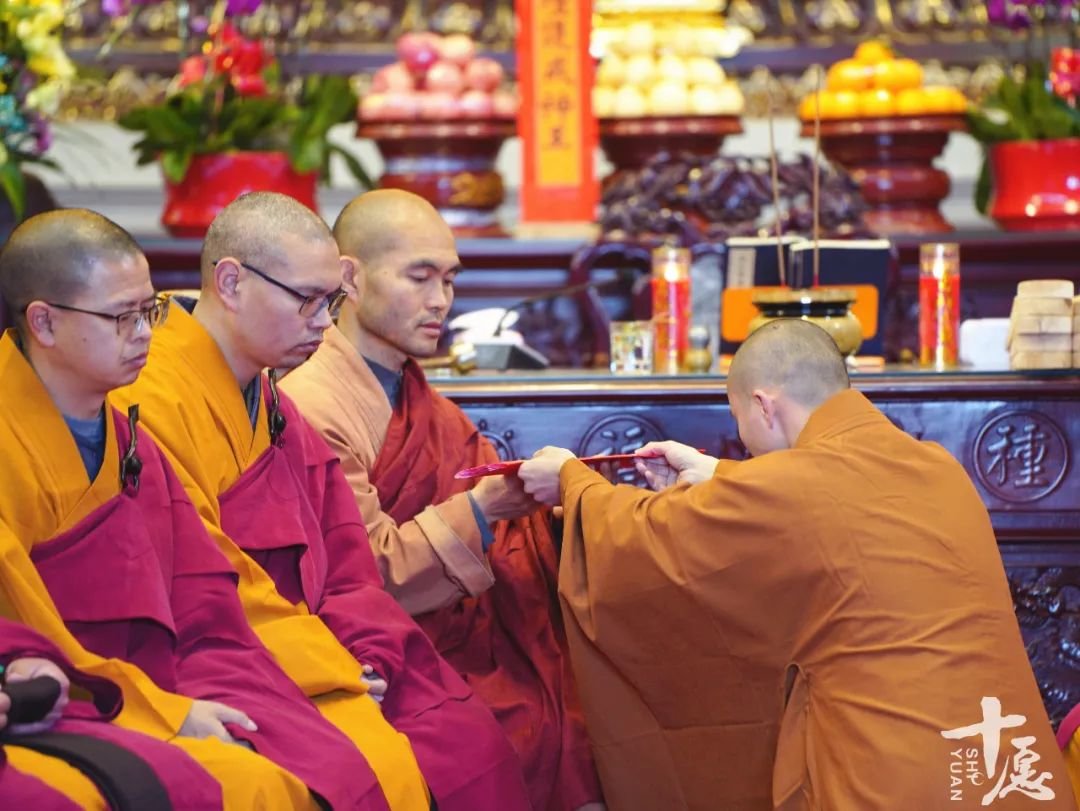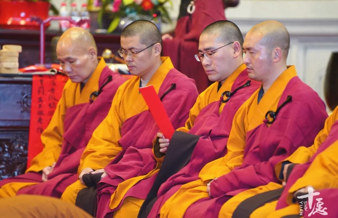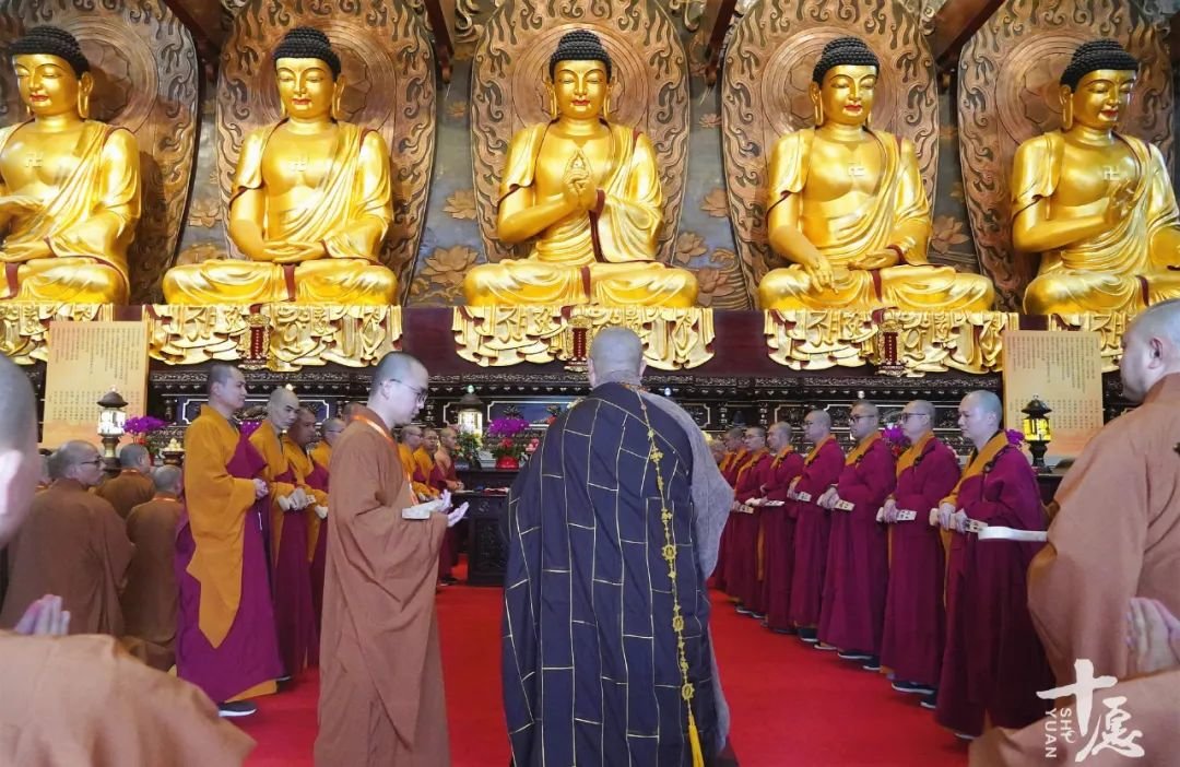 引礼师到大殿后,依位排列,通过庄严的仪式,礼请师父次序入座。