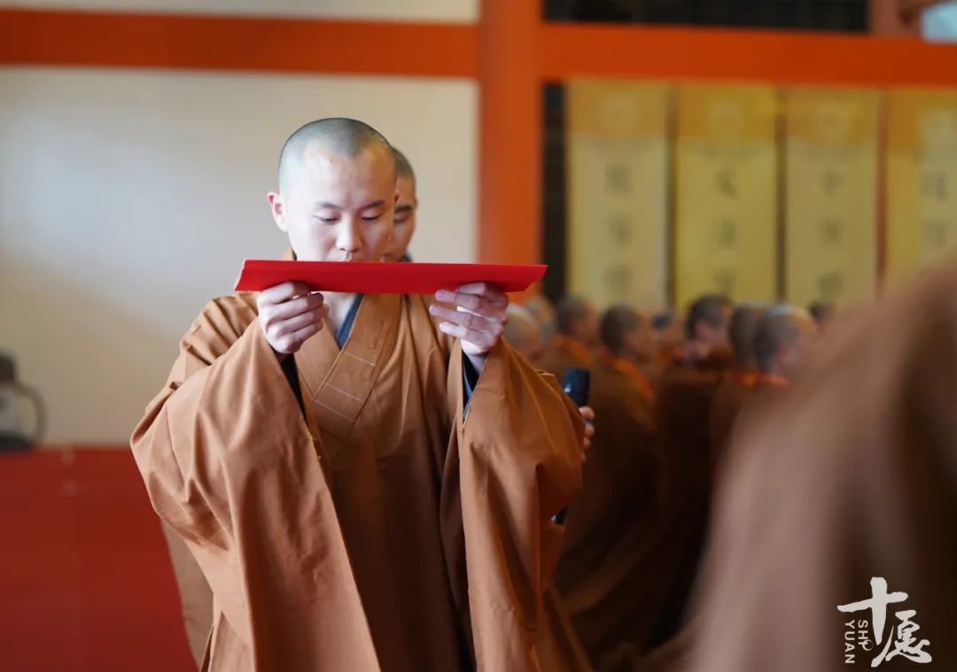 引礼师在殿中坐定后,二位新戒代表敬香唱赞,分别宣读请启。这些启文各有格式,文采各异。师父的启文各不相同,但都由楷书写就。这些启文由丛林中专门从事文书工作的书记撰写。