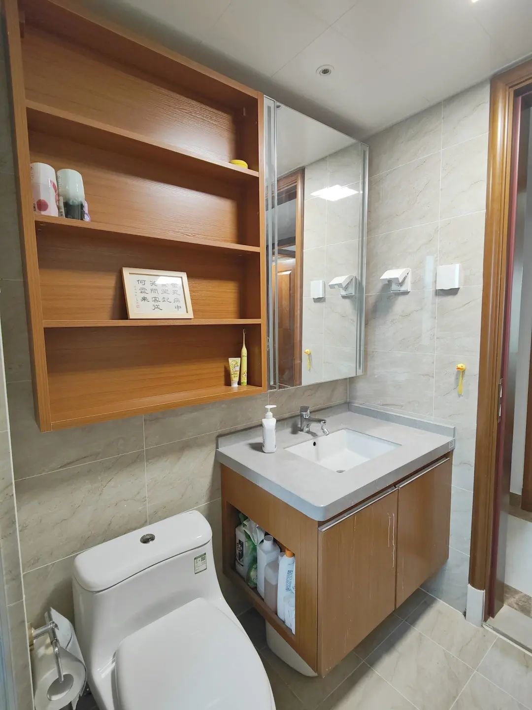 洗手台上方都会装一面镜子,我首先把这面镜子换成了镜柜。镜柜,就是在镜子后面做了一个小柜子。柜子里面可以放一些个人清洁、洗护类的杂物,释放洗手台台面空间。