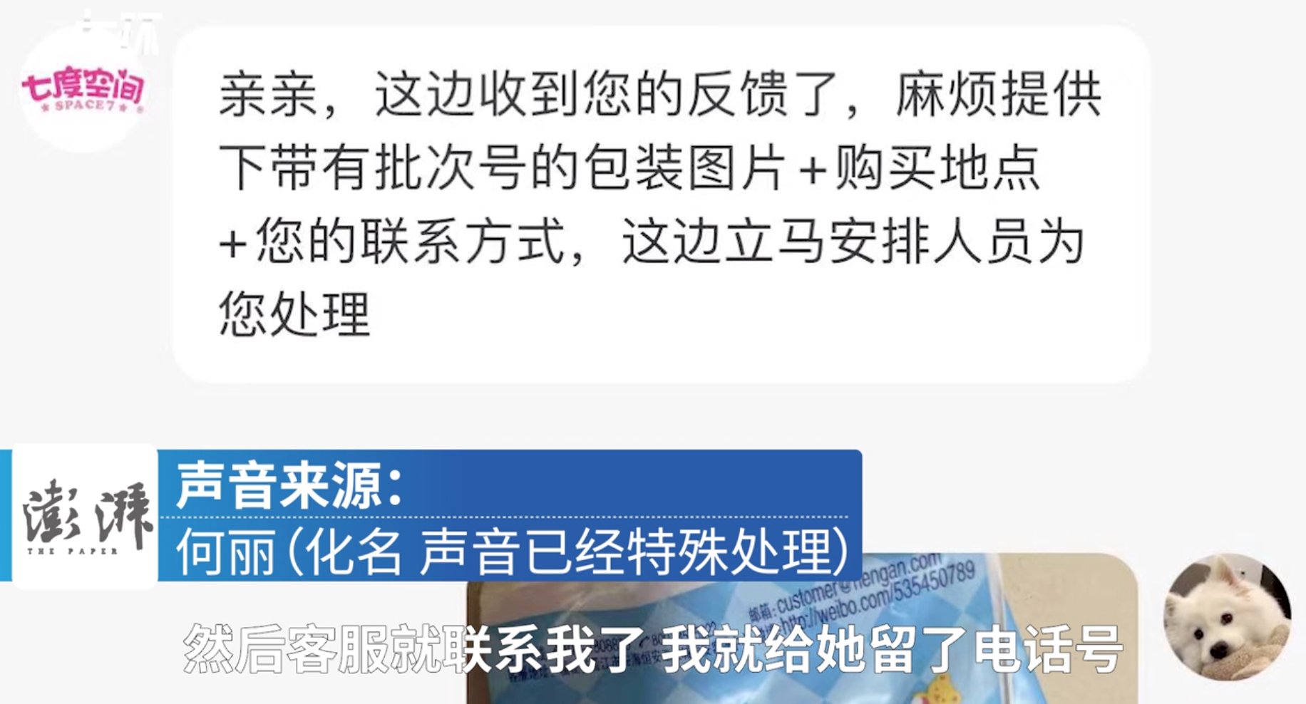 另据澎湃新闻2022年2月17日报道,河北廊坊的女士何丽(化名)反映,其购买的七度空间卫生巾拆开发现夹层内有虫卵。七度空间客服人员表示会跟进处理。何丽已接受对方500元现金赔偿的方案。