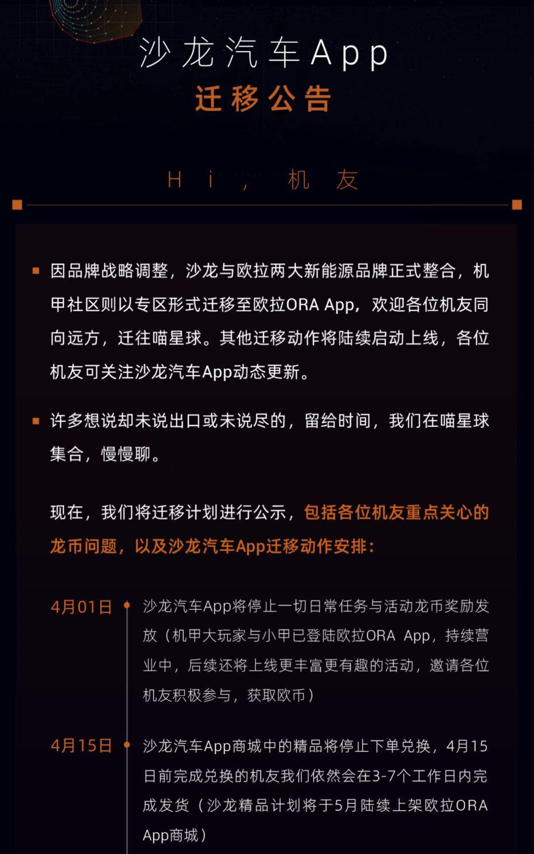 根据3月24日发布的迁移公告,沙龙App将于4月1日停止一切日常任务与活动币奖励发放;4月15日停止商城精品下单兑换,5月陆续上架欧拉App商城;4月30日沙龙App和小程序将正式停止运营。