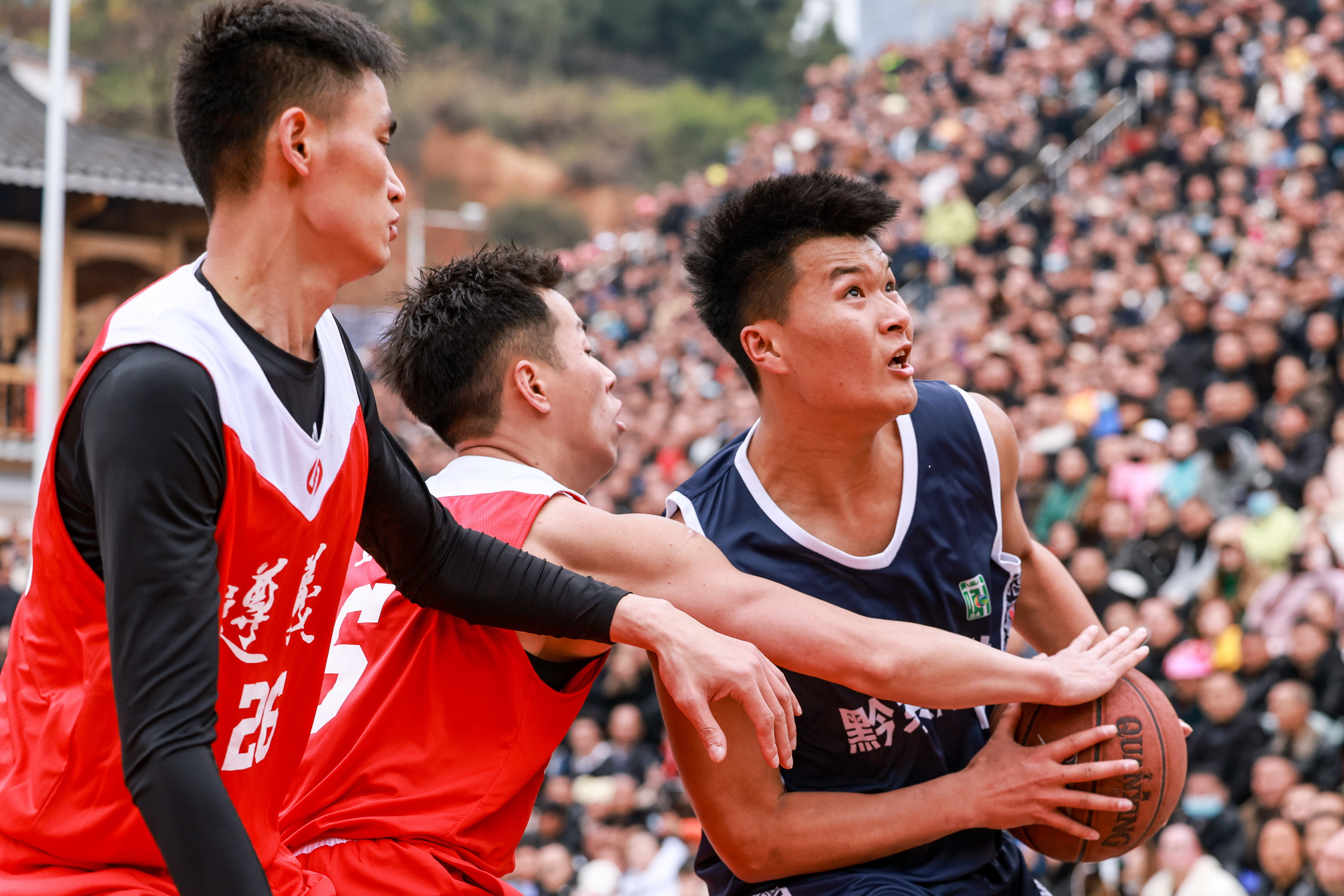 3月27日,黔东南州代表队球员欧明辉(中)在比赛中上篮。新华社记者 吴壮 摄