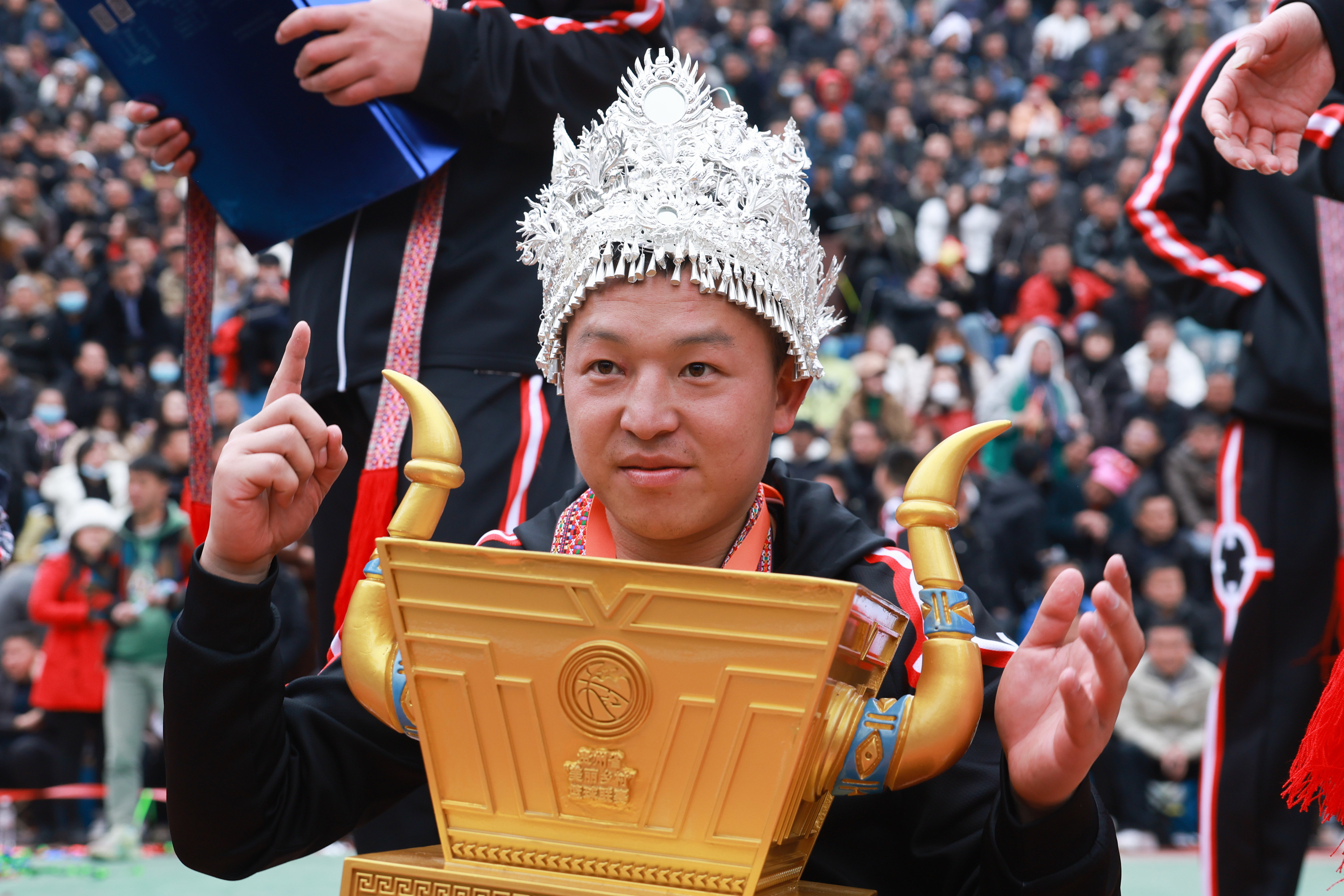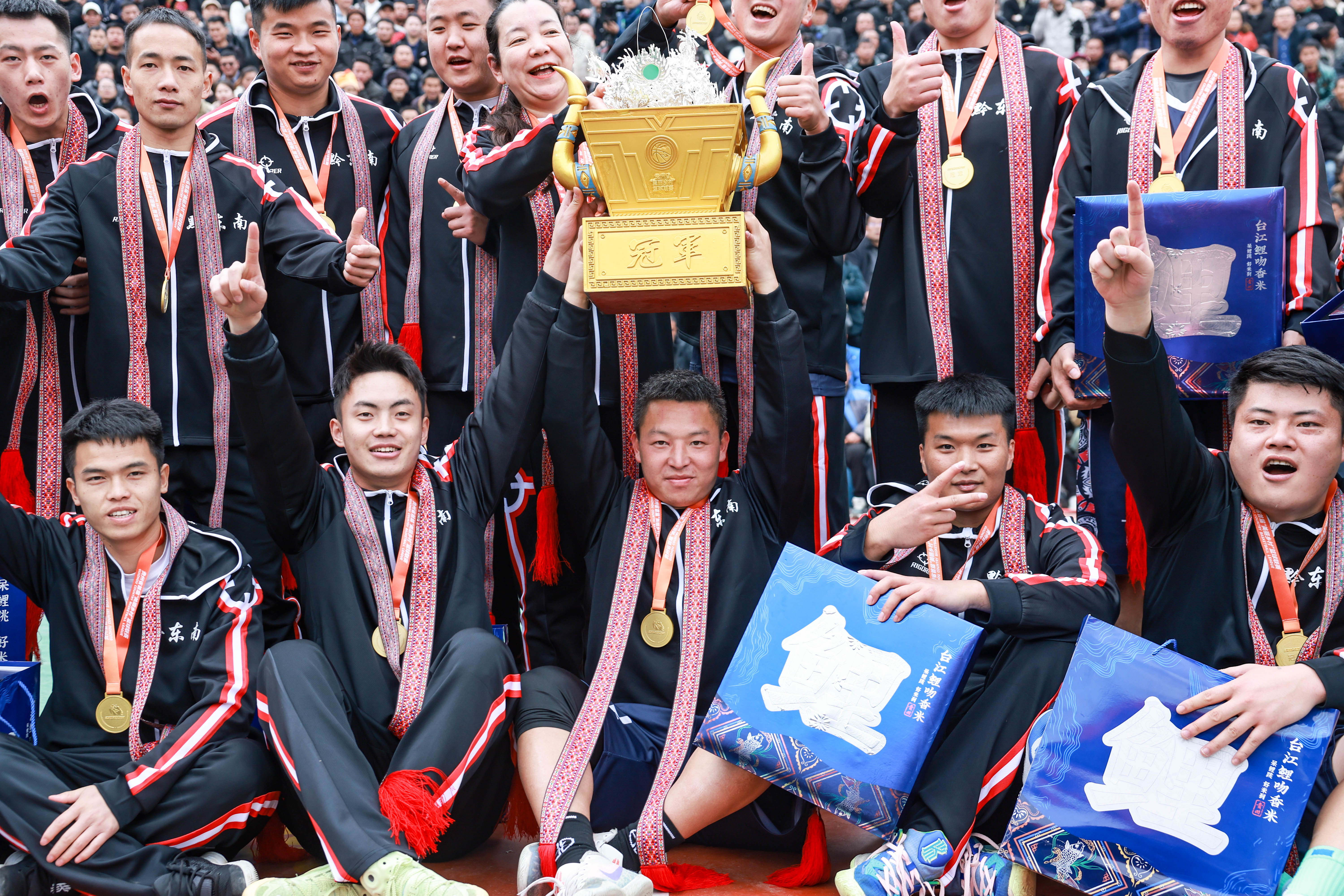 3月27日,冠军黔东南州代表队在“村BA”颁奖仪式上高举奖杯庆祝。新华社记者 欧东衢 摄