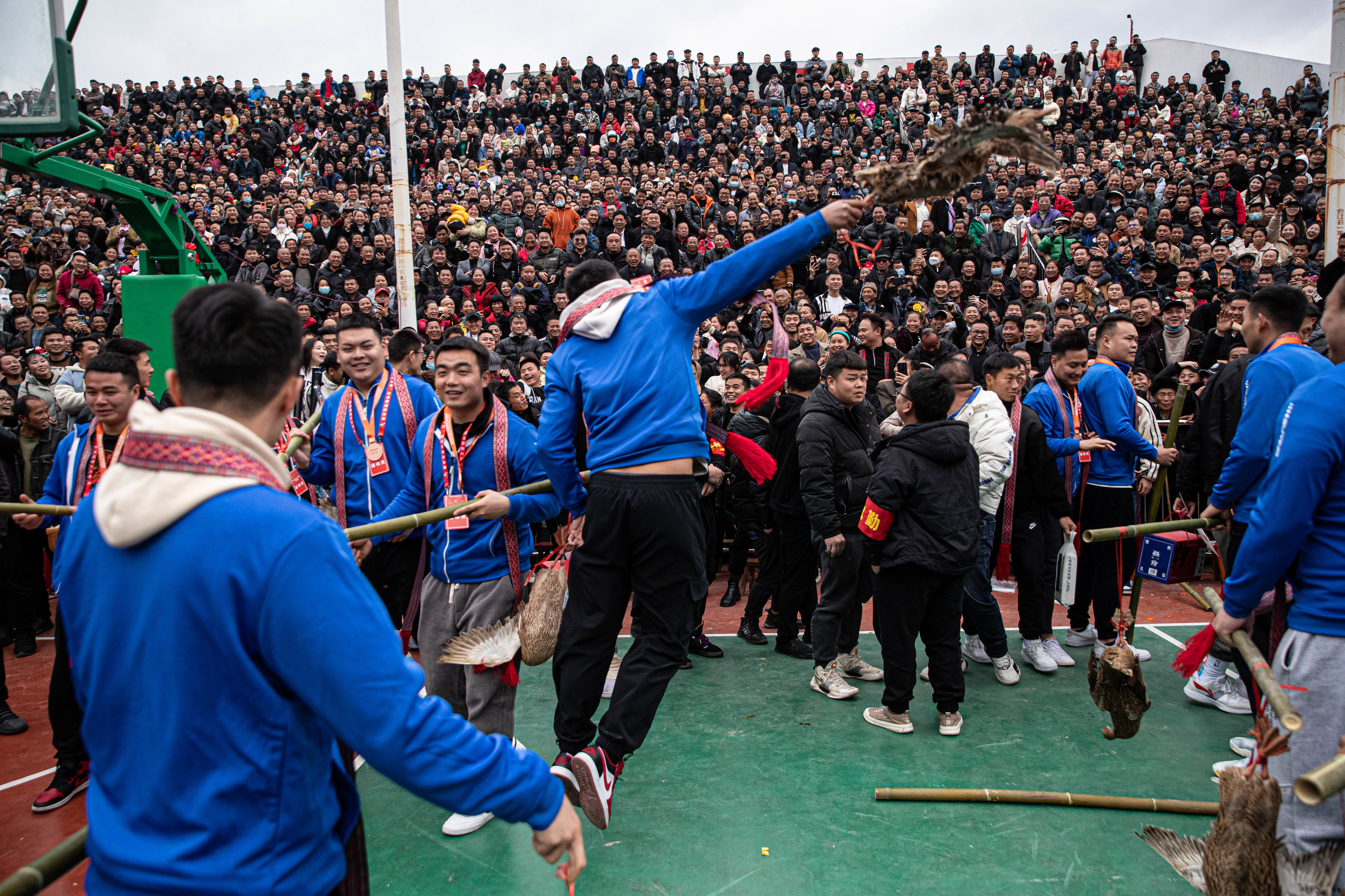 3月27日,季军铜仁市代表队球员在颁奖仪式上将奖品“三穗麻鸭”扔向观众席。新华社记者 吴壮 摄