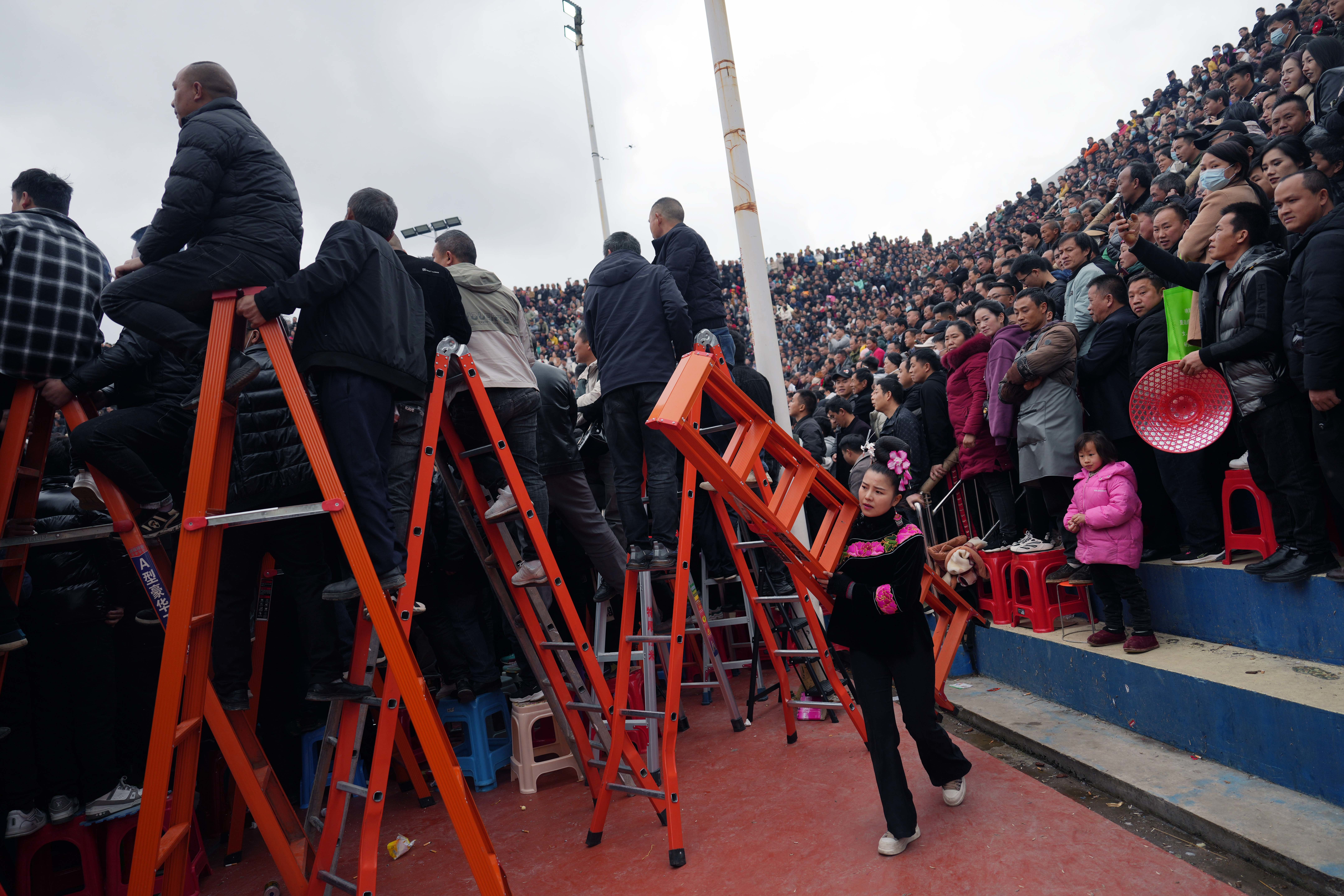 3月27日,观众在场边搭梯子观看比赛。新华社记者 李尕 摄