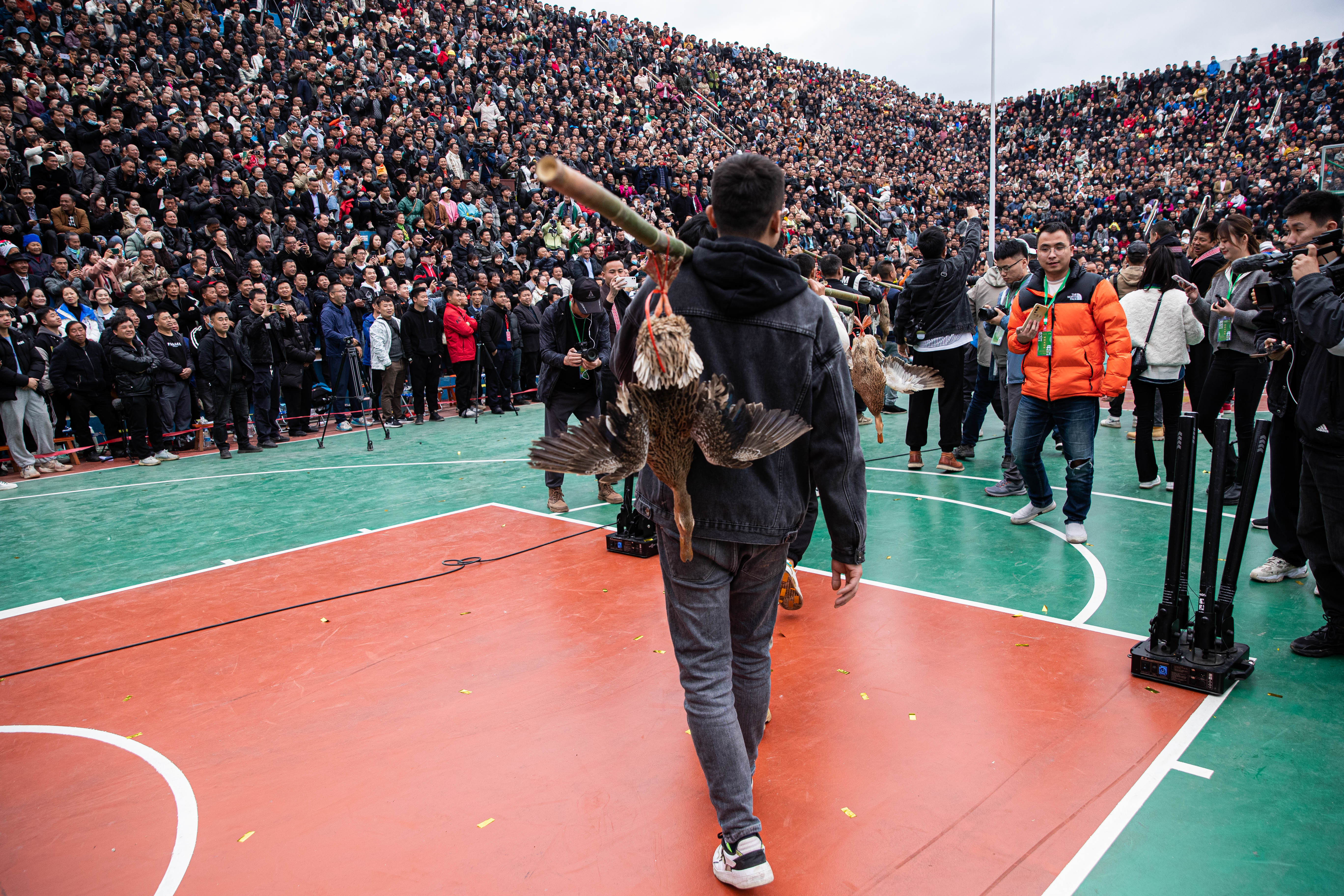 3月27日,工作人员挑着当地农特产品“三穗麻鸭”进入赛场。这是季军铜仁市代表队的奖品。新华社记者 吴壮 摄