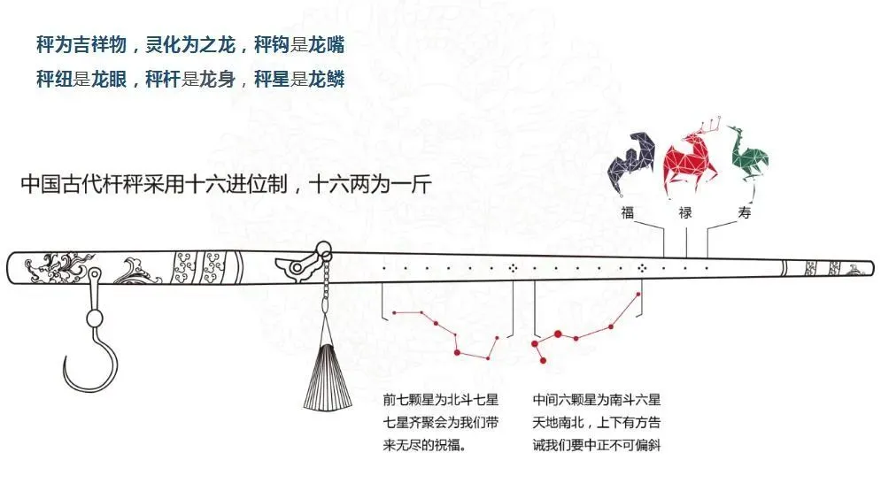 秤套用杠杆原理而成。据说由春秋后期的工匠大师鲁班所设计,亦另有指是由年代相近的政治经济家范蠡所发明。民间流传最初杆秤乃根据北斗七星和南斗六星,在杆上刻制十三颗星花,十三两即为一斤。后来再新增福禄寿三星,合十六两为一斤,形成民间信仰“缺一两少福,缺二两伤禄,缺三两折寿”。此后秦始皇统一度量衡,一斤十六两就成为全国通用千年的单位。