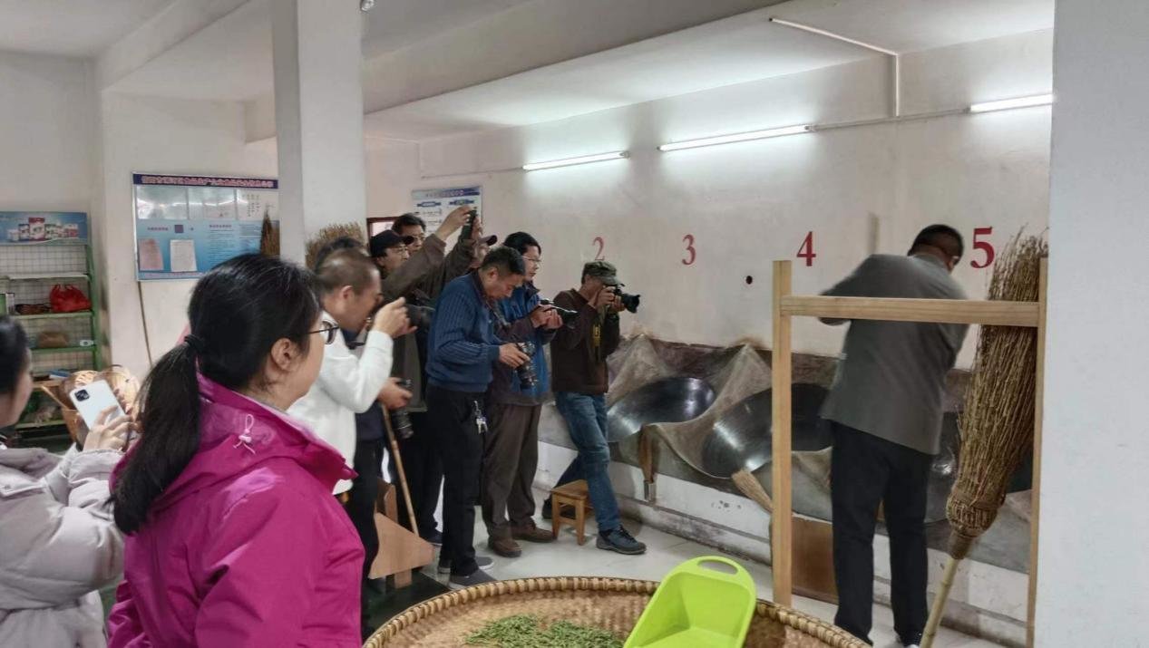 在国家非物质文化遗产传承基地——信阳车云顶峰毛尖(茶)传统炒制工作室,摄影家们全神贯注,对信阳毛尖的纯手工炒制流程:筛选、杀青、捻揉、抓条、烘焙等一系列精湛的技艺与工序,用光影的形式,艺术的手法凝心纪录。热锅里的新鲜茶芽,在非遗传承大师伍德军不停地翻腾下,散发出阵阵清香,沁人心脾。这令现场的摄影大咖们由衷得拍手叫好、啧啧称赞。