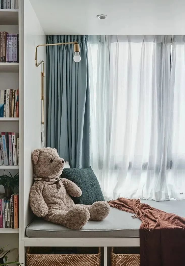 如果卧室位置不够,也不需要大量的收纳,可以从窗户底部入手,因为飘窗的底部也是一个很好的收纳区,放一些小箱子,小柜体也十分合适,不仅可以收纳物品,还可躺可卧,是一个不可多得的休闲角落。