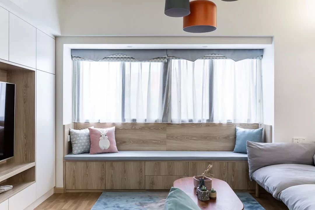很多人对飘窗的印象只停留在书房或卧室区域,其实客厅用飘窗也比较普遍了,客厅根据飘窗的大小来定制不同尺寸的柜子,让飘窗充分利用起来,为客厅增加一些使用功能。