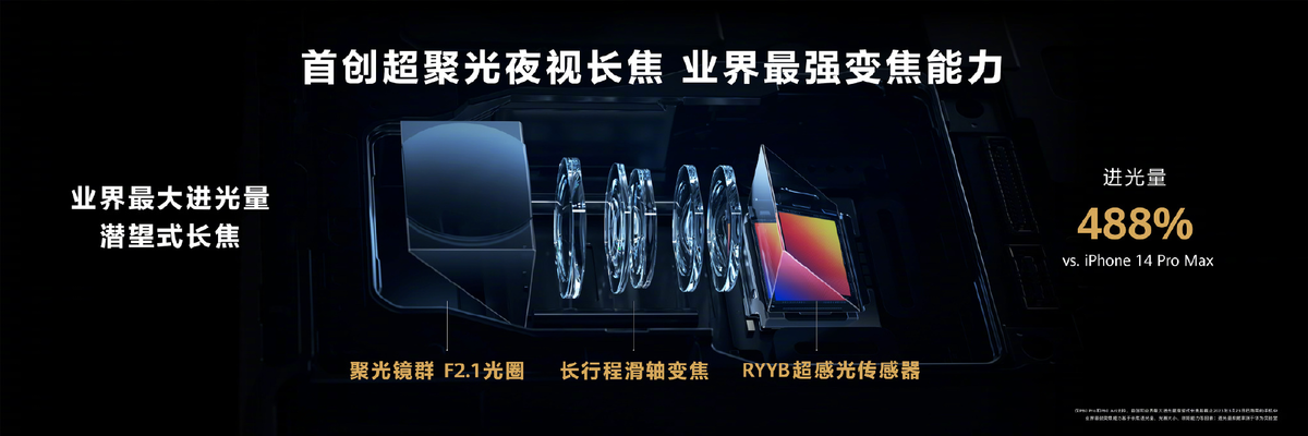 由于体积空间限制,以前的手机长焦镜头大多数采用小光圈和小传感器设计,这就使得在暗光环境下长焦基本不可用。这次华为在长焦暗光场景取得了革命性突破,在华为P60 Pro上搭载了首创超聚光夜视长焦镜头,拥有F2.1超大光圈。配合RYYB超感光传感器的感光优势,让华为P60 Pro的长焦镜头即使在晚上依旧有很不错的成像效果。