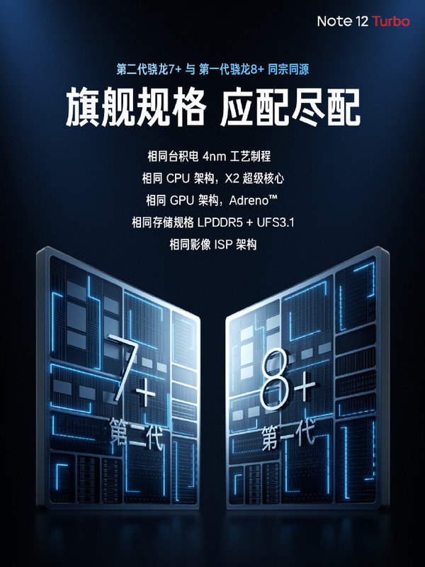 性能方面,Redmi Note 12 Turbo全球首发搭载第二代骁龙7+移动平台,采用台积电4nm工艺,搭配LPDDR5+UFS 3.1,安兔兔跑分1010385分;带来超高性能、更低功耗;配备3725mm2超扩散导流VC均热板、14层立体石墨,散热能力提升35%,让手机时刻动力澎湃。另外,这款手机还搭载了狂暴引擎,实现热门游戏全高帧,其中《王者荣耀》60分钟极致画质,平均帧率119.2fps。
