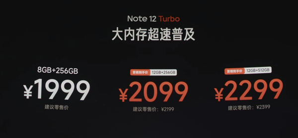 最后在价格方面,Redmi Note 12 Turbo 8GB+256GB版本售价1999元,12GB+256GB版本售价2199元(首销2099元),12GB+512GB版本售价2399元(首销2299元),16GB+1TB版本售价2799元(首销2599元)。